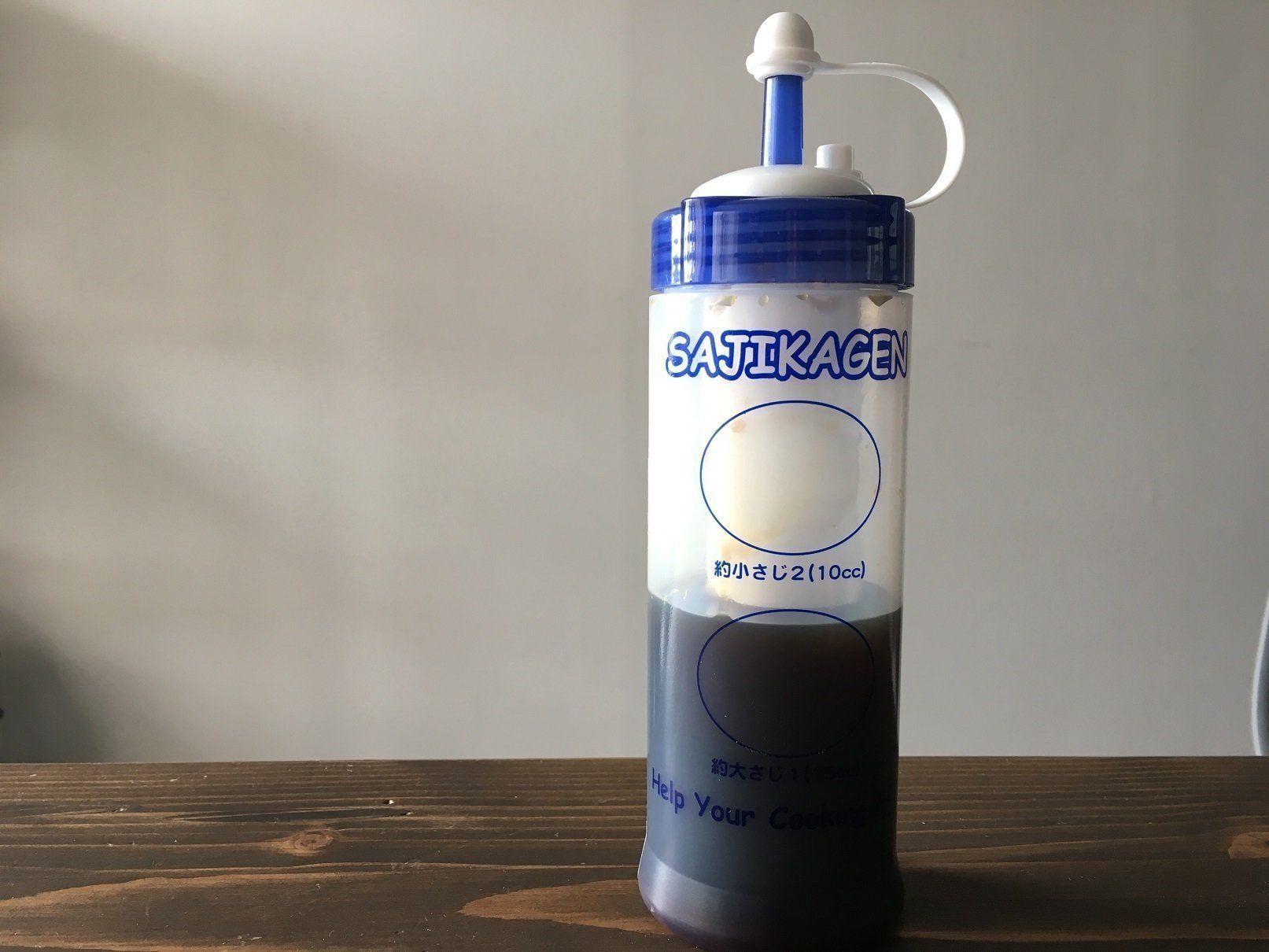 今回紹介するのは、ニトリで購入した「調味料入れ(サジカゲン)」。デザインは青と赤の2色展開で価格は228円(青色)。この商品、ただの調味料入れではありません。商品名にもあるとおり、ワンプッシュで大さじ1、小さじ2といったサジカゲン(匙加減)ができてしまうすぐれものなのです!