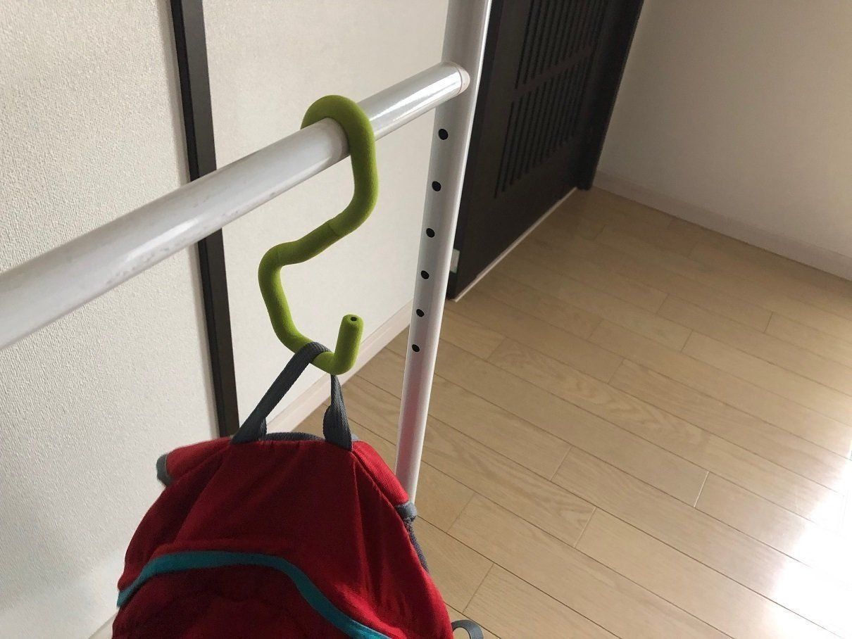 家庭内はもちろん、車のヘッドレストにかければ、後部座席の人の荷物かけにもなりますし、傘などの定位置にも便利。重さ約20kgのリュックをかけても変形することはないので、ふつうの使い方であれば問題ないでしょう(ちなみに、約35kgのリュックをかけたらぐにゃっと変形しました)。