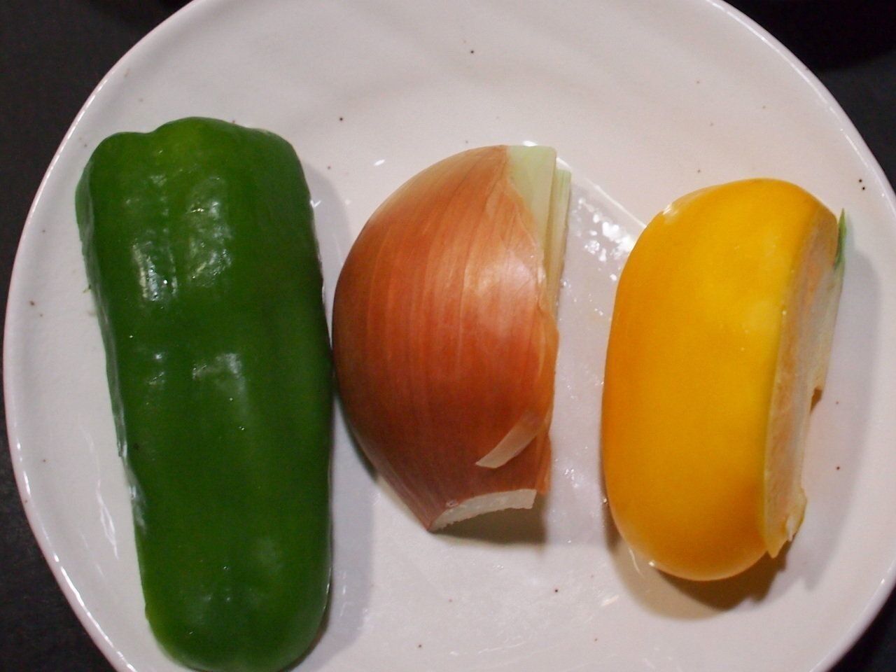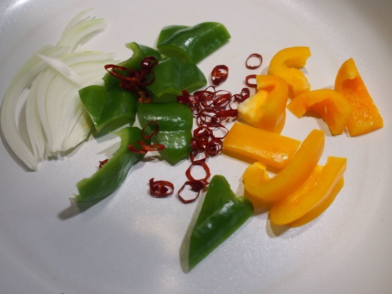 まずは、レトルトカレーには入っていない野菜を足します。冷蔵庫に入っている野菜ならだいたいは大丈夫だそうですが、おすすめはピーマン、パプリカ、ナス、れんこんなど。耐熱皿にラップをかけてレンチンします。味つけは必要ナシで、コツは火を入れすぎないことです。食感が少し残るくらいがベストです。