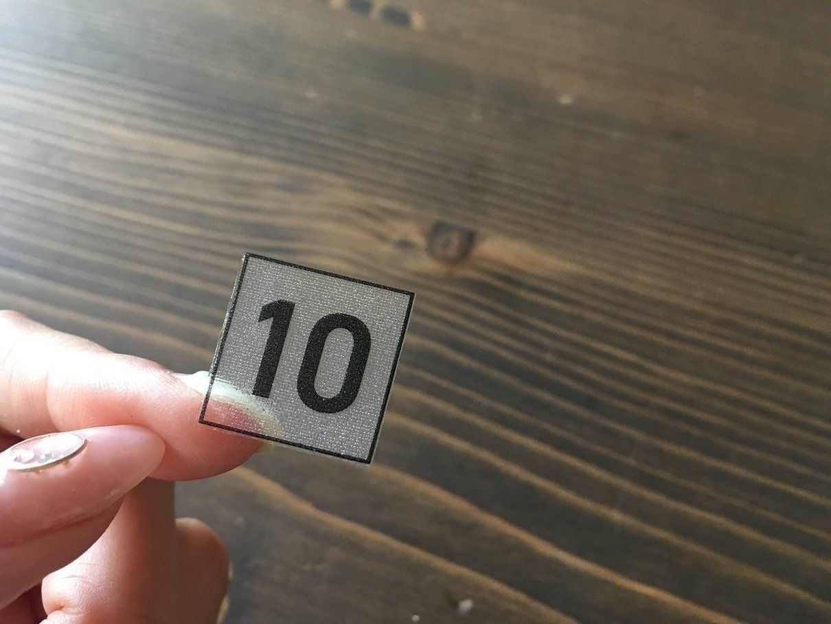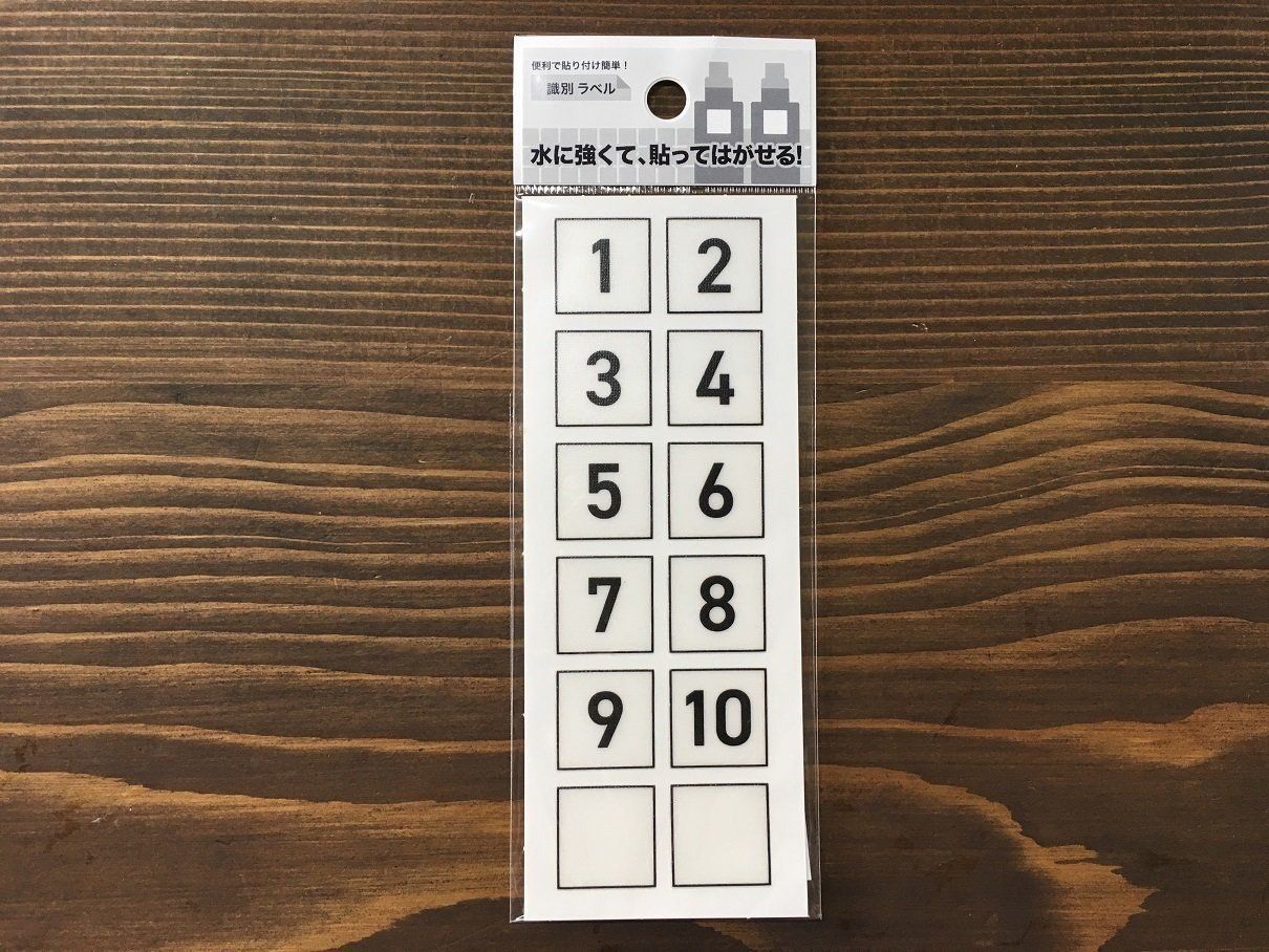 今回紹介するのは、ニトリの「識別ラベル ナンバー管理用(ナンバー10)」。価格は185円。シールは12枚入っていて、ナンバリングされているのは10まで。2枚は無地になっています。1枚あたりの大きさは2×2cmの正方形です。