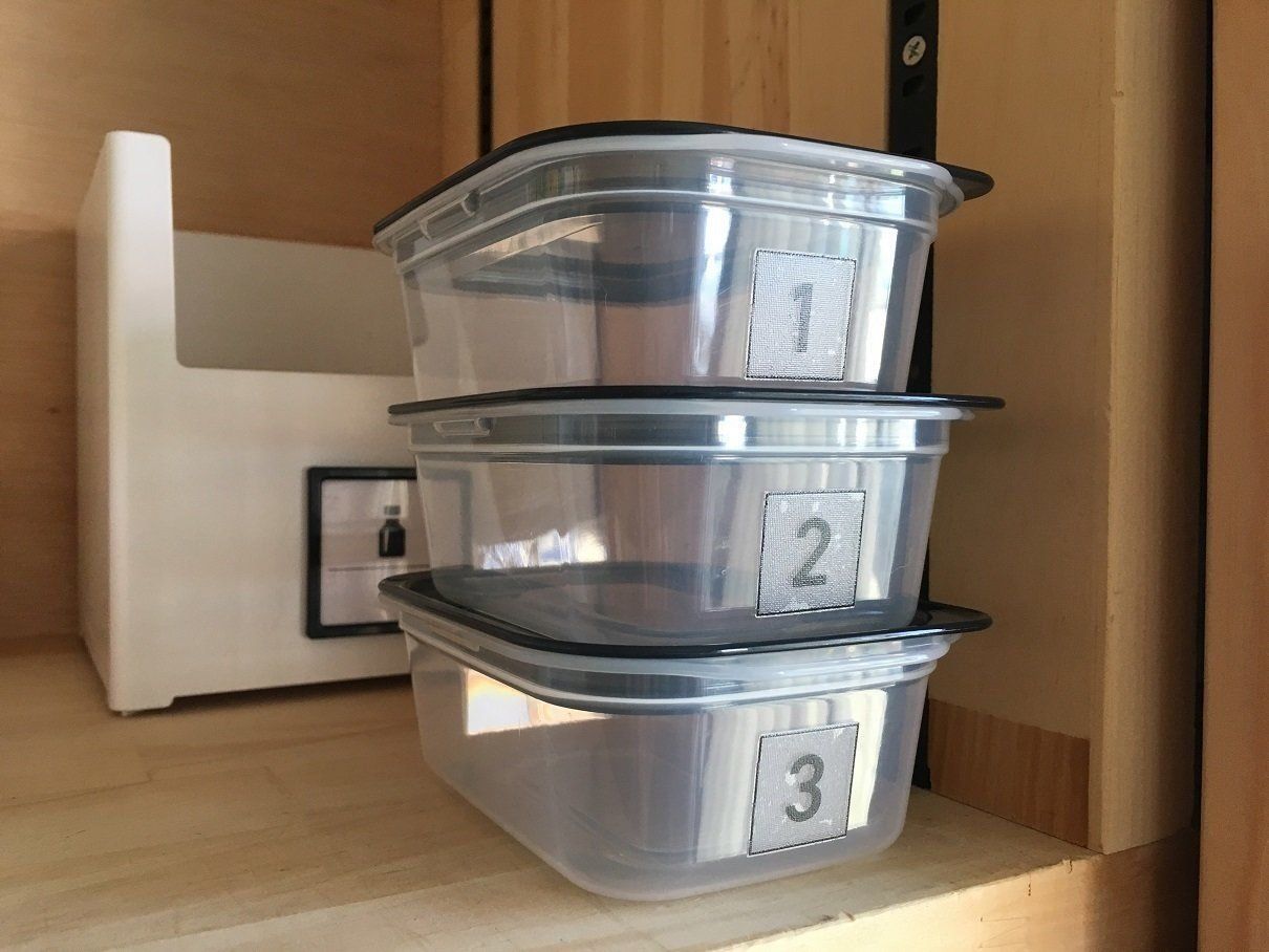 たとえば、透明や半透明で中身がわかりにくい同じサイズのタッパーに貼ってみたり、調味料入れに貼ったりすれば、番号で簡単に識別できちゃいます。