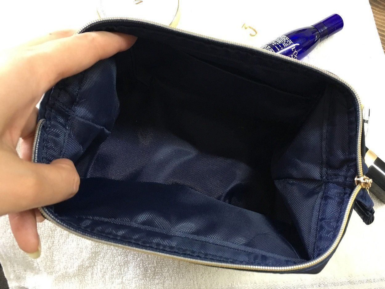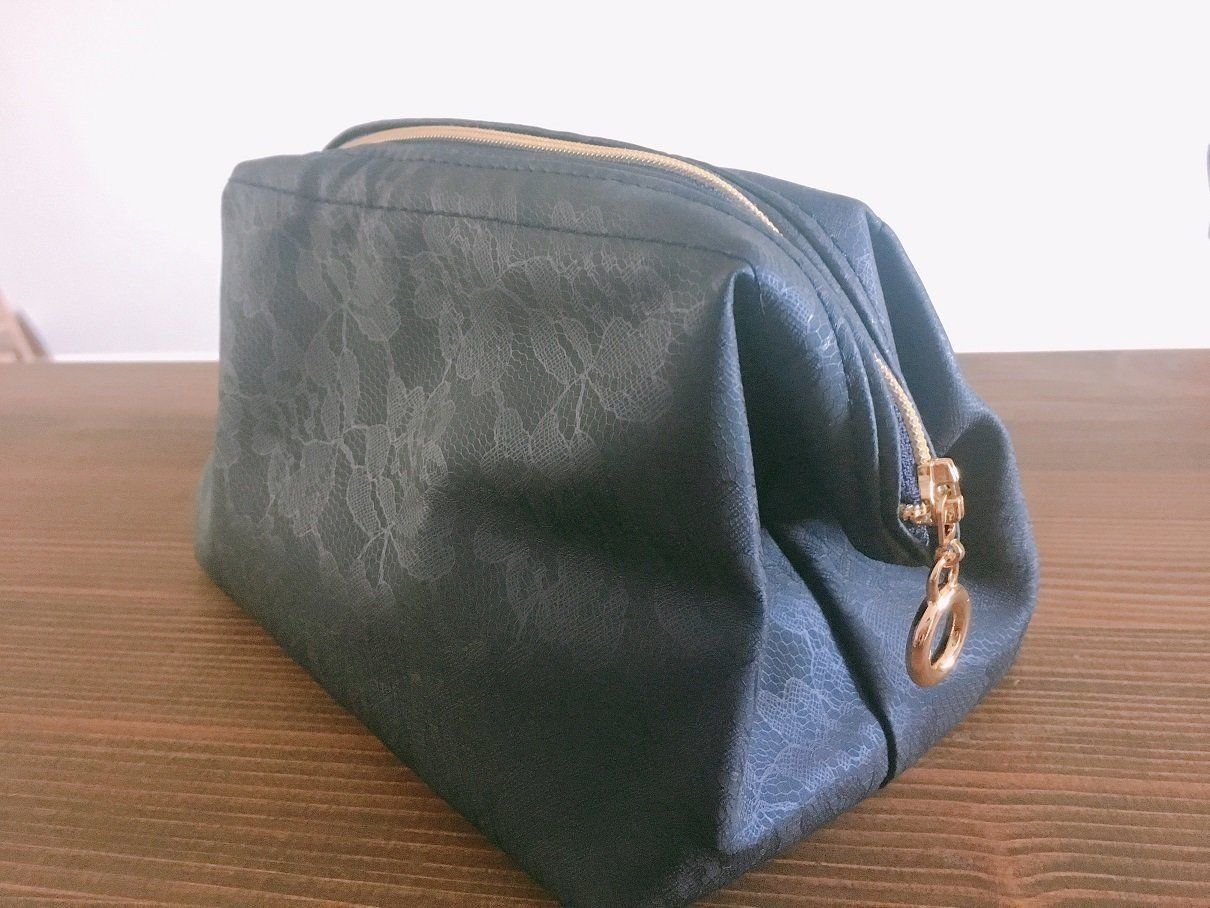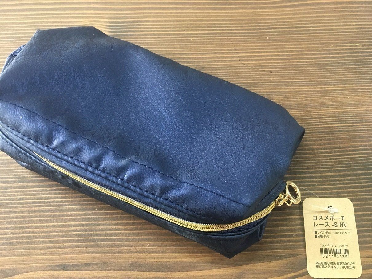 ニトリ デコホームで販売されているコスメポーチは、複数サイズ・カラーが展開されています。そのなかから今回チョイスしたのは、「コスメポーチ レースS・ネイビー」。価格は税込925円。レースのプリントがさりげなく入っていて、エレガントでフェミニンなイメージが好きなかたには、とくにおすすめです。