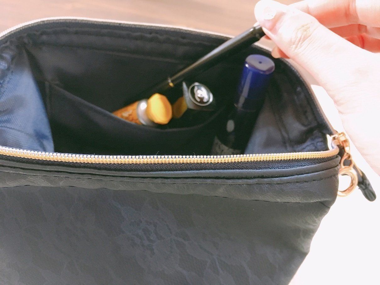 ポーチの中には内ポケットが1ヵ所あるので、細かいものはここに入れておけば、散らばることもありません。高さが11cmもあるので、リップやミニサイズのハンドクリームなどが立てて入れられるのも、うれしいポイント。