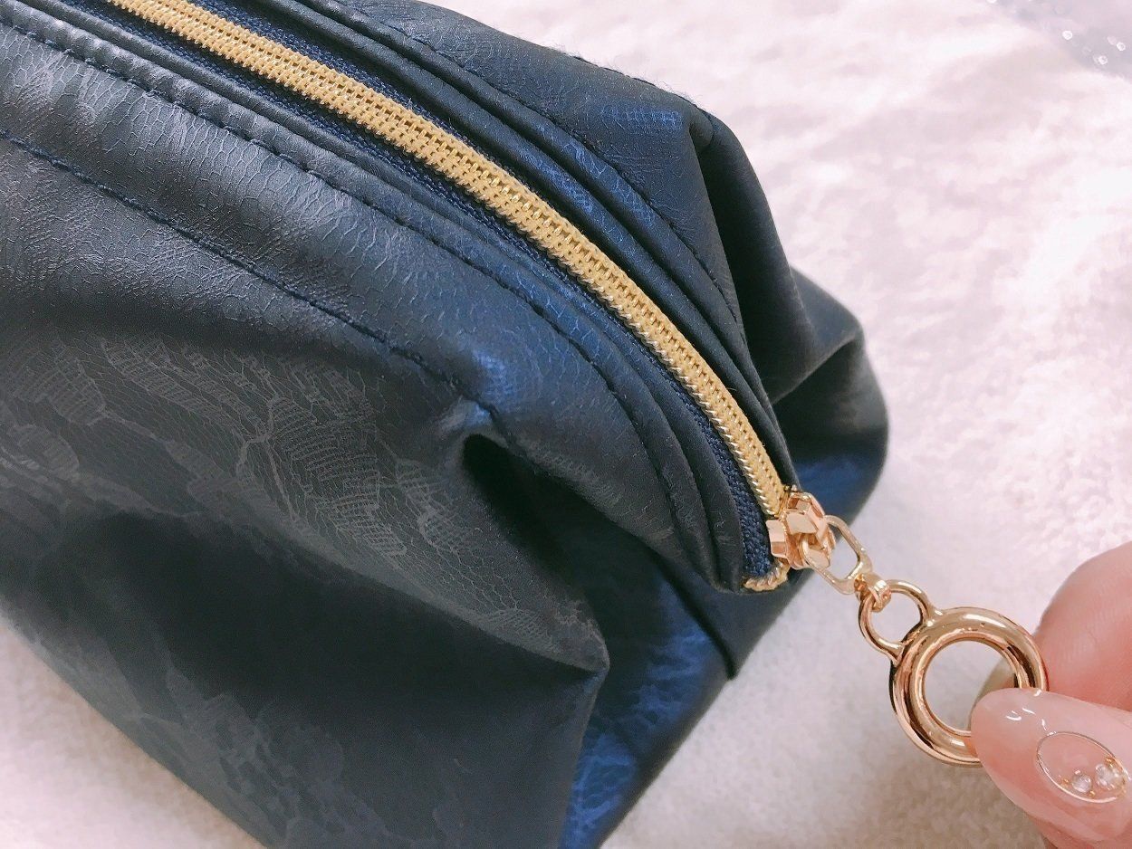 そのほか、ファンデーションからリップペンシルまで日常的に使うベーシックなコスメが入ります。ゴールドのチャームがついたファスナーも、開閉しやすくてかわいいですね。