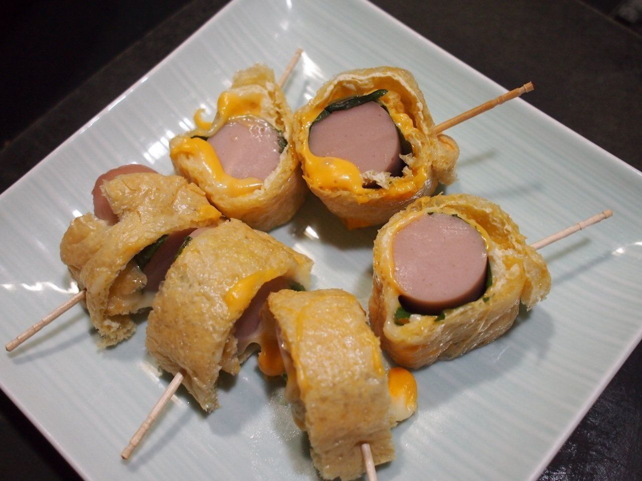 つくり方は簡単で、まずは油揚げをハサミで切って開き、端に魚肉ソーセージを置いたら、スライスチーズと大葉を敷いてクルクル巻いていきます。巻き終えたら等間隔に爪楊枝を刺して油揚げを留めて、そのままトースターで焼くだけ。