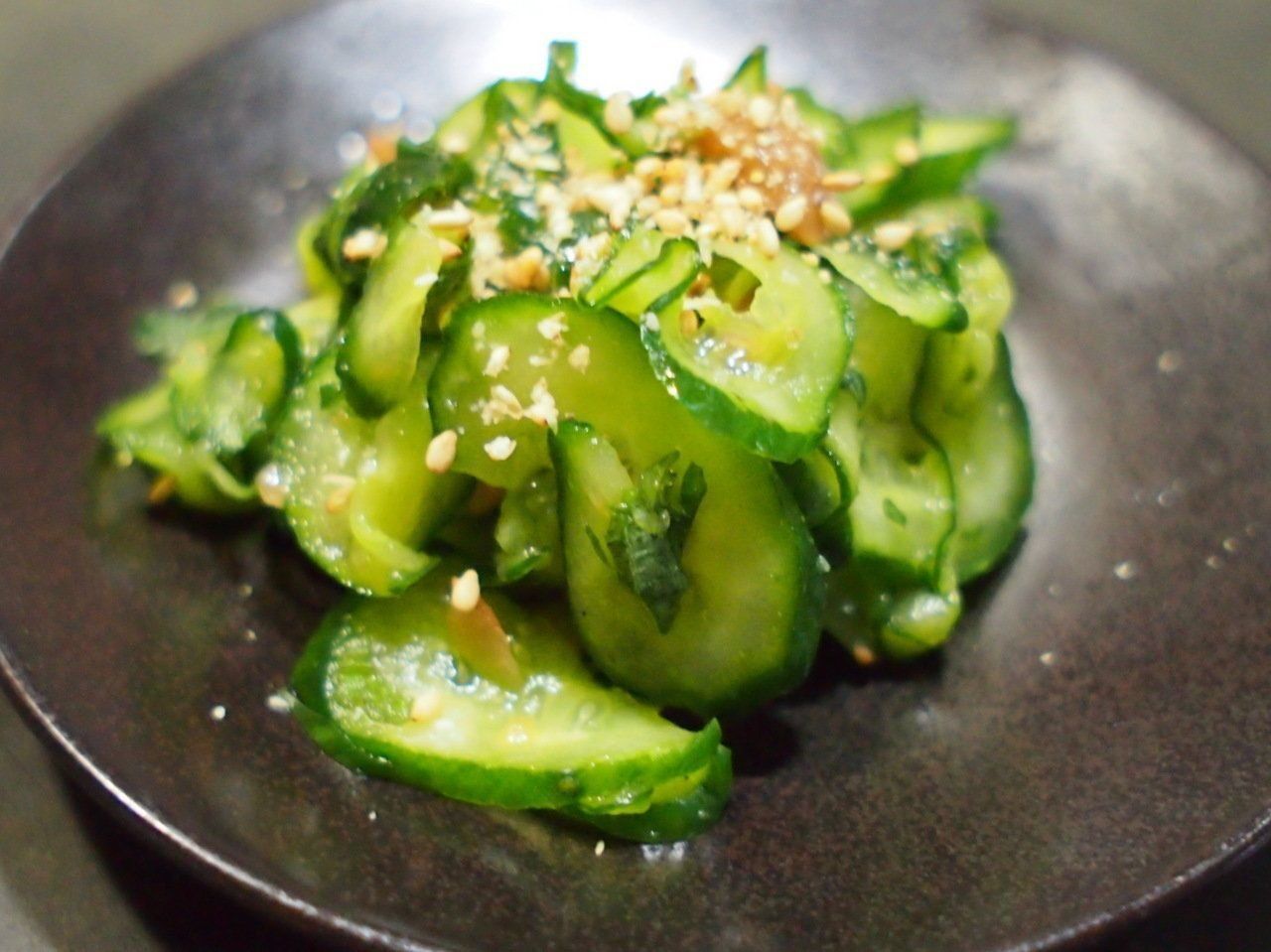 まず、キュウリを薄切りにし、塩で揉んでおきます。続いて梅干しの種をとってみじん切りにして、そこへ大葉のみじん切りを加えてよく混ぜる。最後に塩もみしたキュウリを水洗いし、水気を切ったら、梅干しと大葉のみじん切りと混ぜます。これを皿に盛り、すり胡麻をかけたらできあがり。