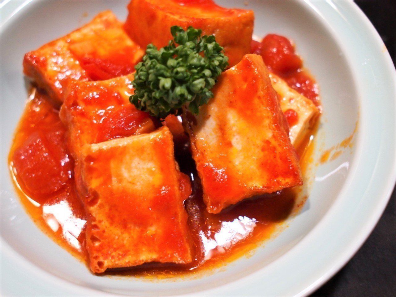 塩コショウなどで味をととのえたら、お皿に盛って、パセリを添えます。乾燥パセリをふりかけてもよし。厚揚げというと和風な味付けになりがちですが、こうして洋風のメニュもおいしくいただけます。