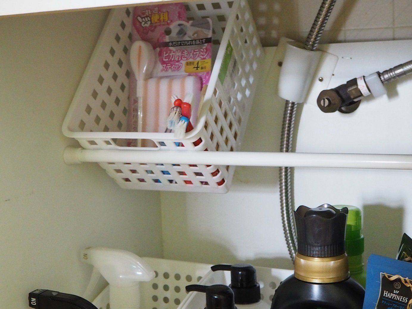 洗剤ボトルなどを立てて収納した際、上部に空間ができます。そんな空間も突っ張り棒とかごで有効活用。歯ブラシや雑巾のストック、掃除用スポンジなどを収納するのに便利です。