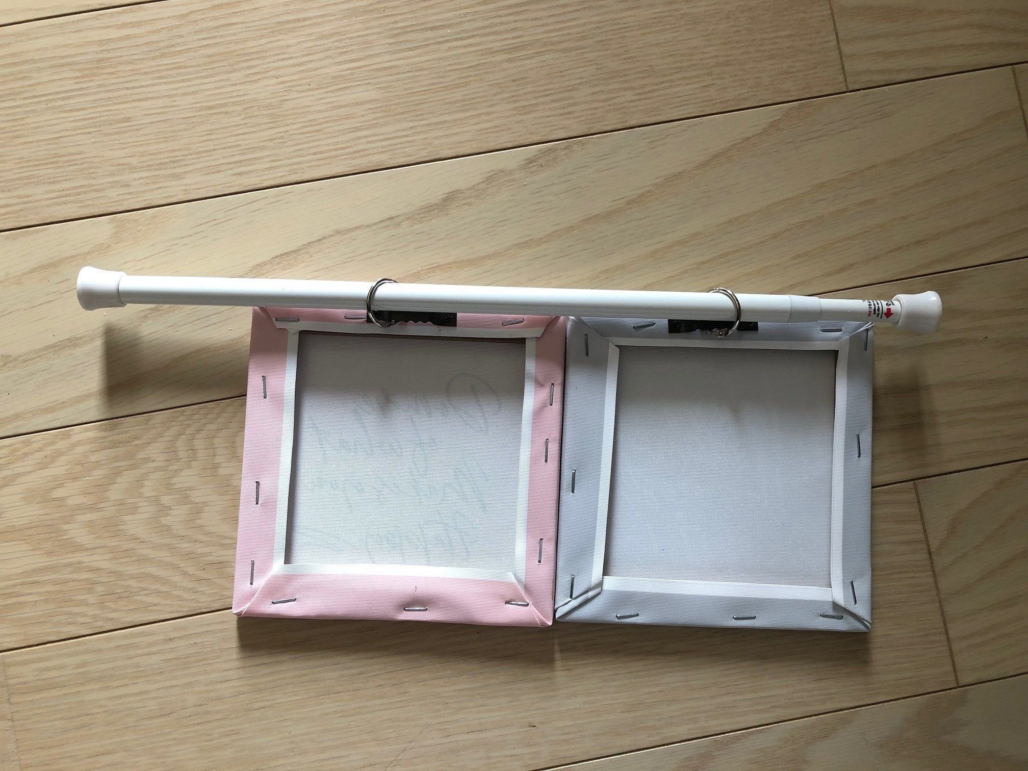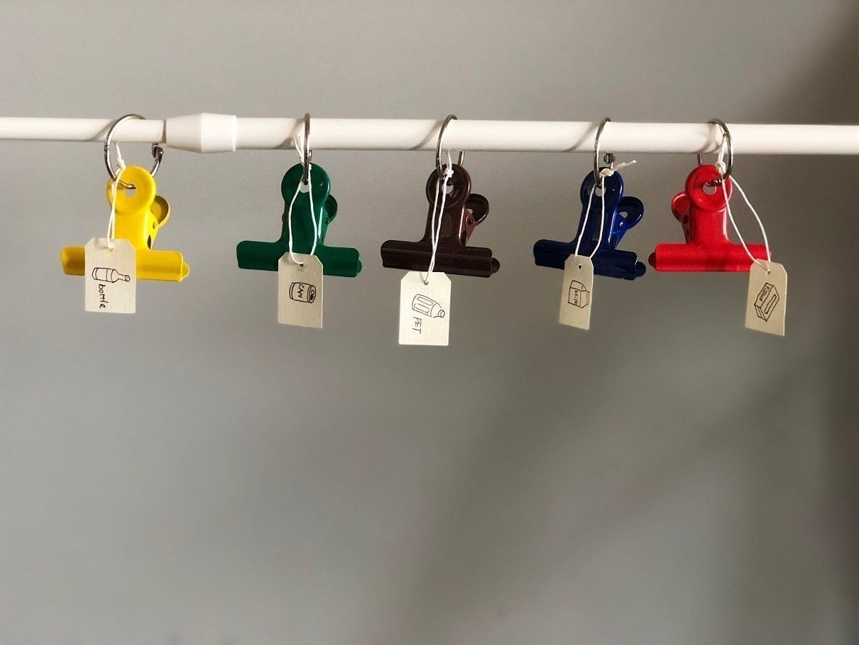 突っ張り棒とカードリングと、目玉クリップがあれば、シンプルなごみステーションに早変わり。