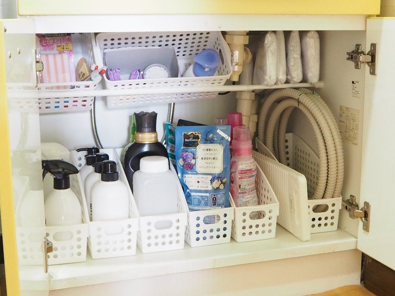 洗面化粧台下を有効に使いたいけれど、配管が邪魔ですっきり収納できない!というかたには突っ張り棒と100均かごがおすすめ。