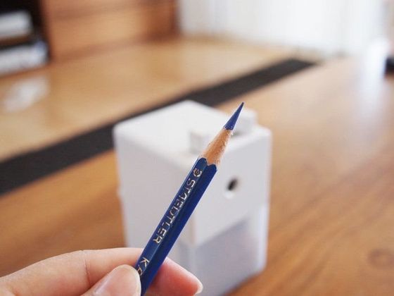 削り具合は、このようにキンキンに尖らせてくれます。色鉛筆などにはあまり向いていないかも。ただ子どもが自分で削ってくれるという点においては、便利そのもの(我が家の場合はこれがないときはカッターで削っていました)。通常の鉛筆などの準備には、とても向いています!