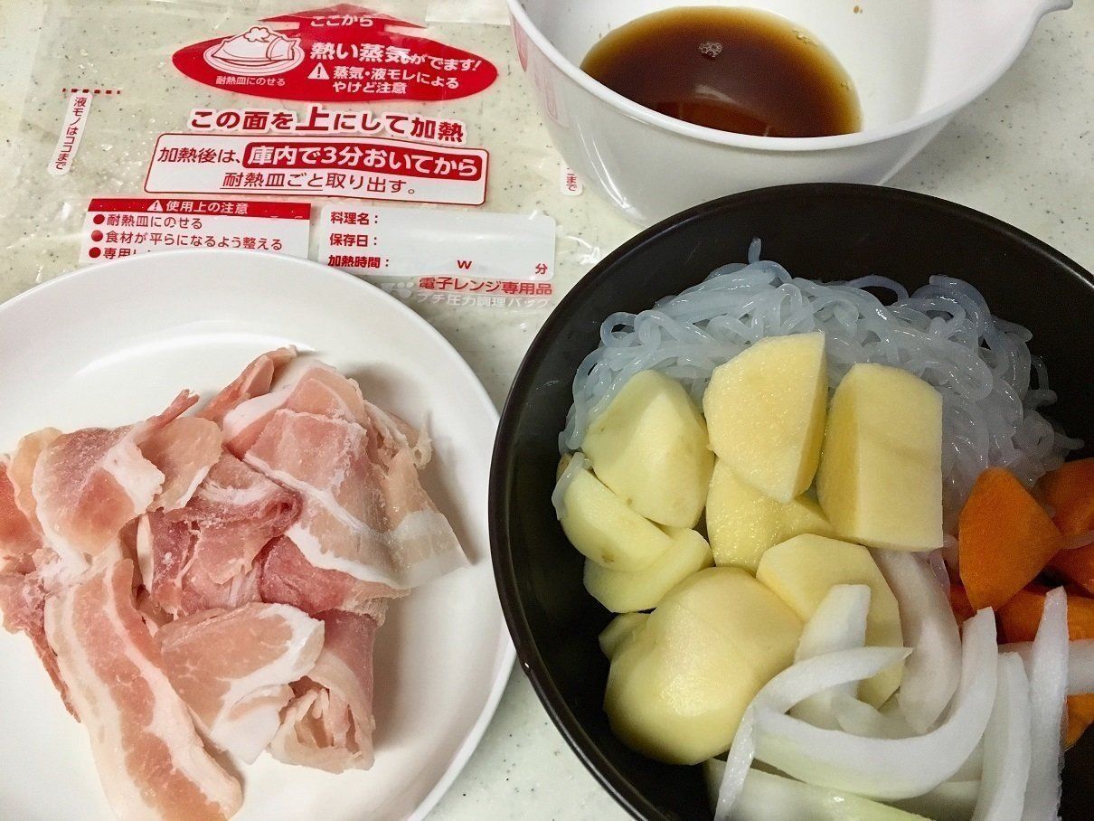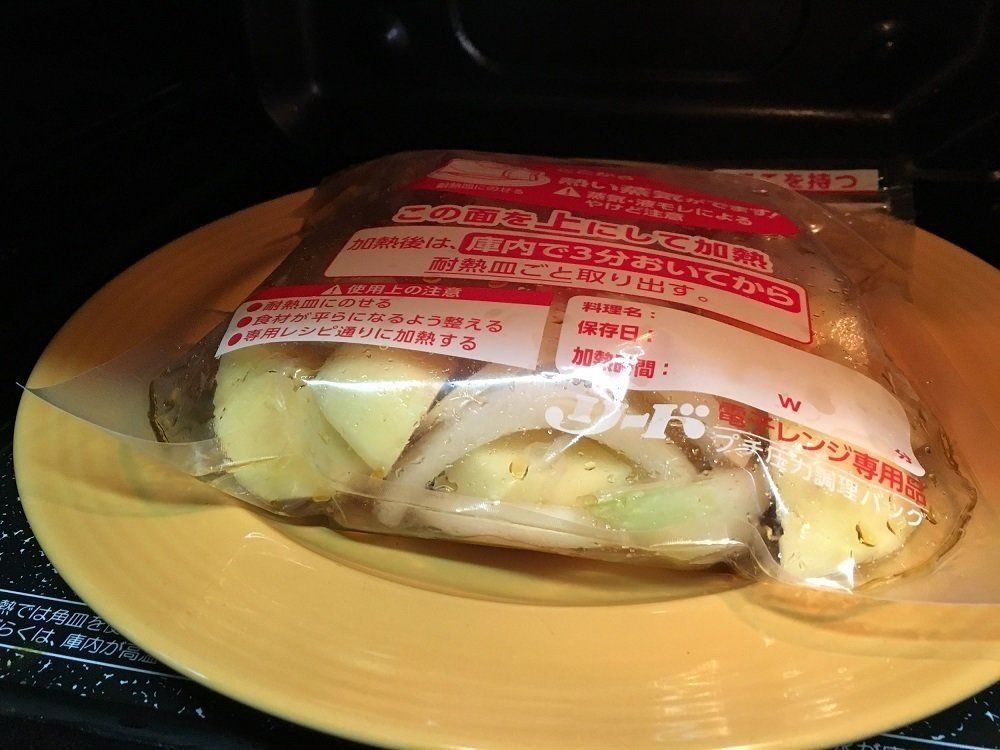 「プチ圧力調理バッグ」の使い方は、とってもシンプル。必要な材料と調味料をバッグに入れてチンするだけです。そこで今回はまず、肉じゃがに挑戦してみました。