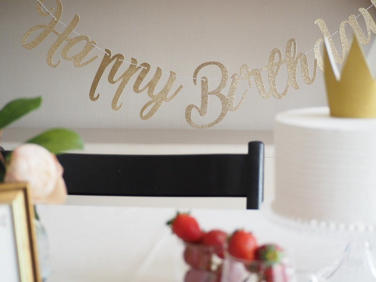 パーティーといえばやはりガーランド!書体もかわいいこちらのガーランドは、壁に貼り付けるだけでお誕生日の雰囲気を盛り上げてくれます。クラウンと同じくグリッターの紙でできているのも高ポイント。価格は100円。