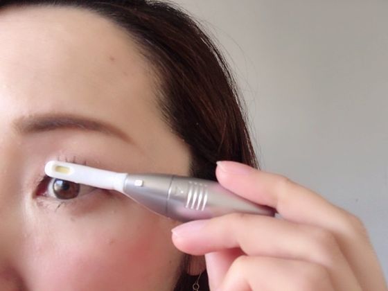 スイッチを入れると2分ほどで適温になり、アイロン部分の後ろ側が緑色から黄色に変化。まつげを乗せ、まぶたと平行になるようにしたら約3秒静止して、その後毛先のほうへまつげを持ち上げながら動かします。