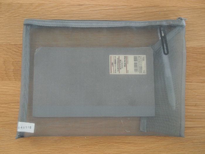 「ナイロンメッシュケース・ペンポケット付きA5サイズ」に入れて使うこともあります。十分なゆとりがあり、資料なども持っていけるところがこれまた素敵。ありそうでなかったスリムノート、価格は190円(税込)とお買い得なので一度試してみてくださいね!