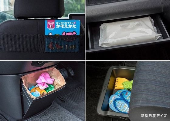 子連れのおでかけはどうしても小物が多くなります。車内に散乱していつも、あれがない、これがないと大騒ぎ…。新型日産デイズは収納もかなりの数。ドリンクホルダーはもちろん、子連れドライブに必須のウエットティッシュなどをセットできるスライドボックス。深めのボックスはゴミ箱にしてもよし。助手席下のボックスは、取り外して洗えるから砂まみれのビーチサンダルを入れても大丈夫。ほかにもあれこれしまえて、車内はすっきり!