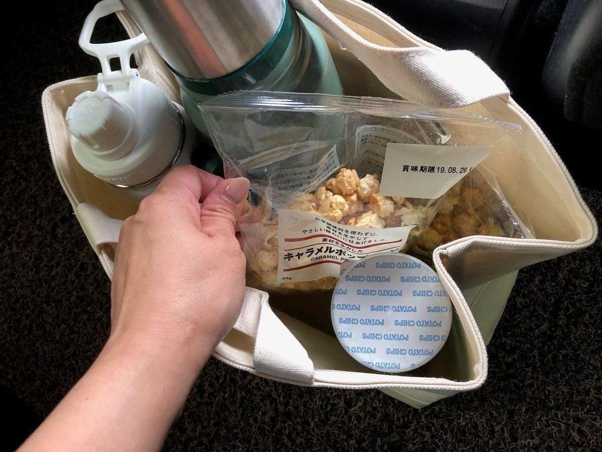 子どもの水筒やお菓子も、足元にこのバスケットを置いてひとまとめに。プラスチックのかごと違って多少幅になじませられますし、使わないときは畳んでトランクへ入れておけます。