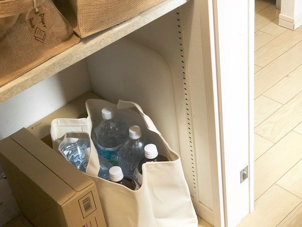 取っ手がついているので、よく場所を動かす小物やおもちゃなどをまとめて収納するのに便利です。たとえば、まとめ買いのお水やお茶などをすっきり収納するのにもピッタリ!季節で在庫が少なくなったらそれに合わせてバスケットもたたんで収納できちゃいます。