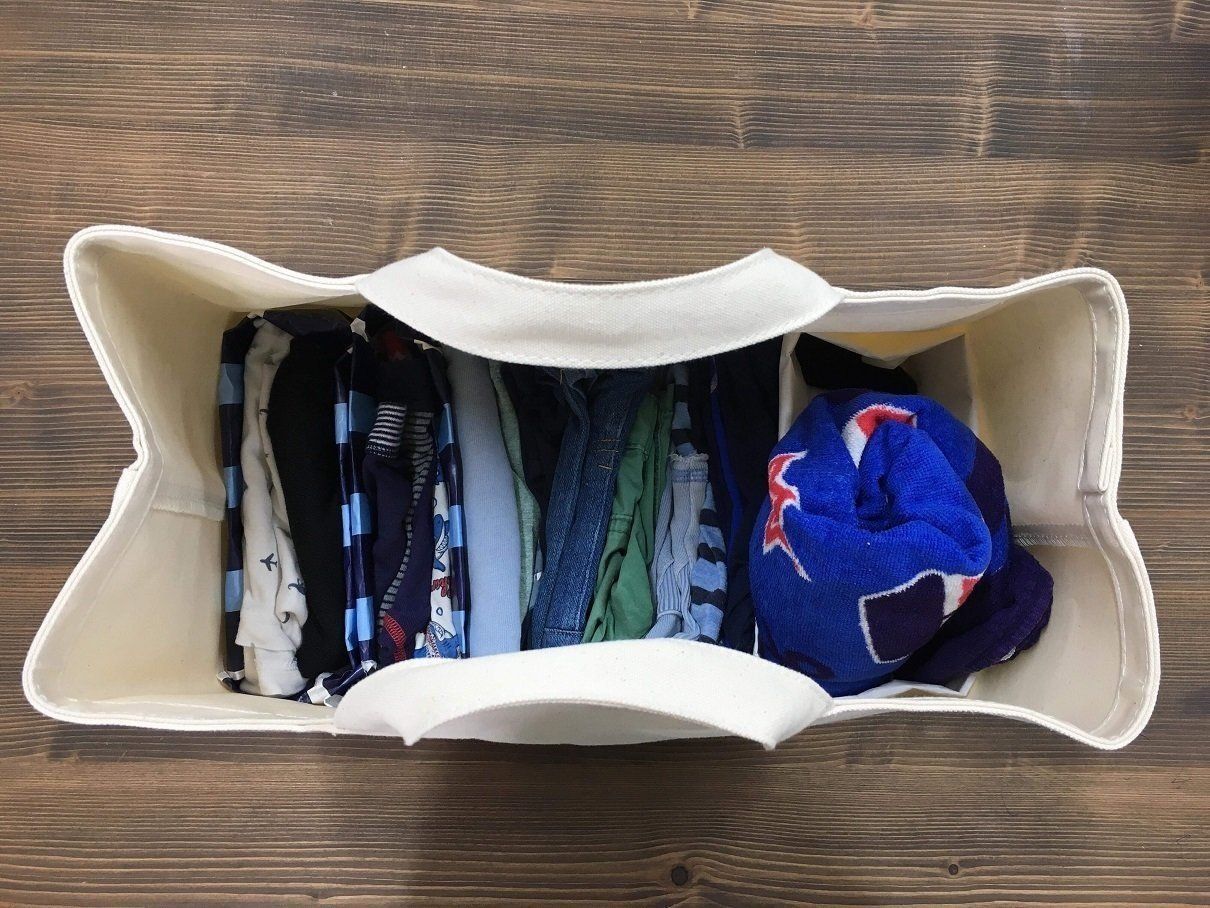 子どもの着替えをたたんで立てて収納。バスケットが衣装ケース代わりになります。