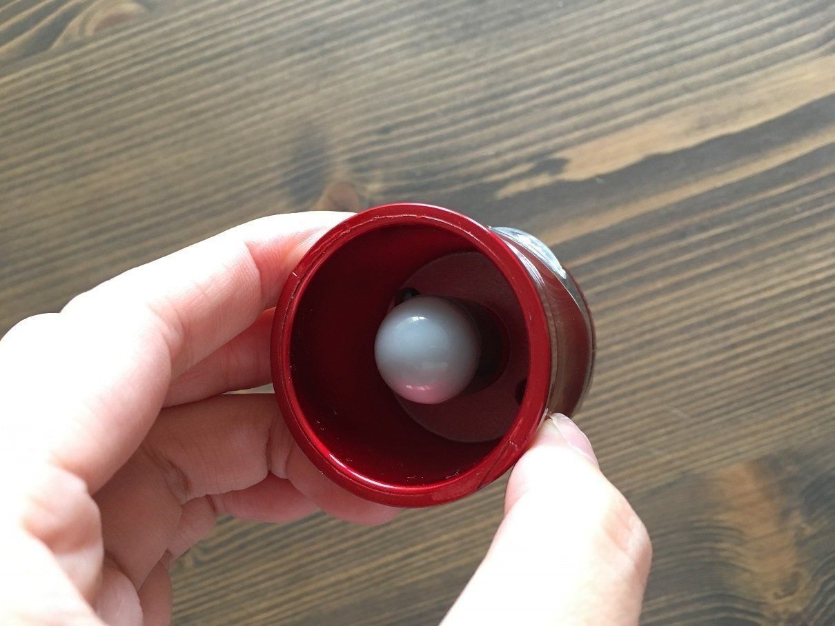 サイズは5.8cmで、片手に収まるサイズ感。重さは40gと軽く、内側の白いシリコーンゴム製のストッパー部分以外は樹脂でできていて、耐熱は70℃となっています。