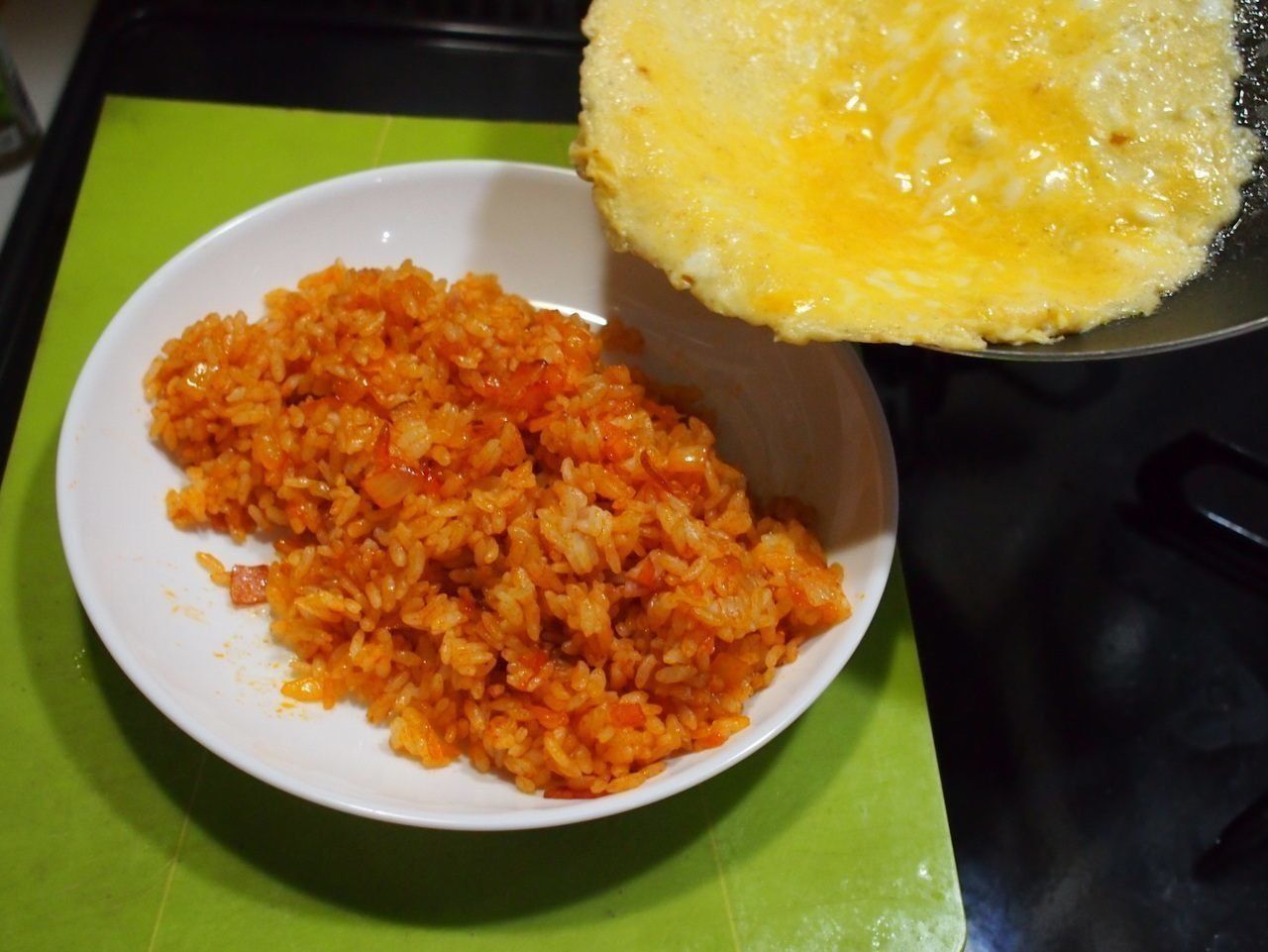 これは町中華の大将に教えてもらった方法ですが、まず皿にチキンライスを盛ります。そこへ、フライパンで焼いた卵をかぶせるのです。町中華の大将は中華鍋で卵を焼いていましたが、もちろんフライパンでも大丈夫です。ふわトロ系の場合はかぶせてそのままケチャップをかけて出来上がりですが、堅焼き系は次のステップがあります。