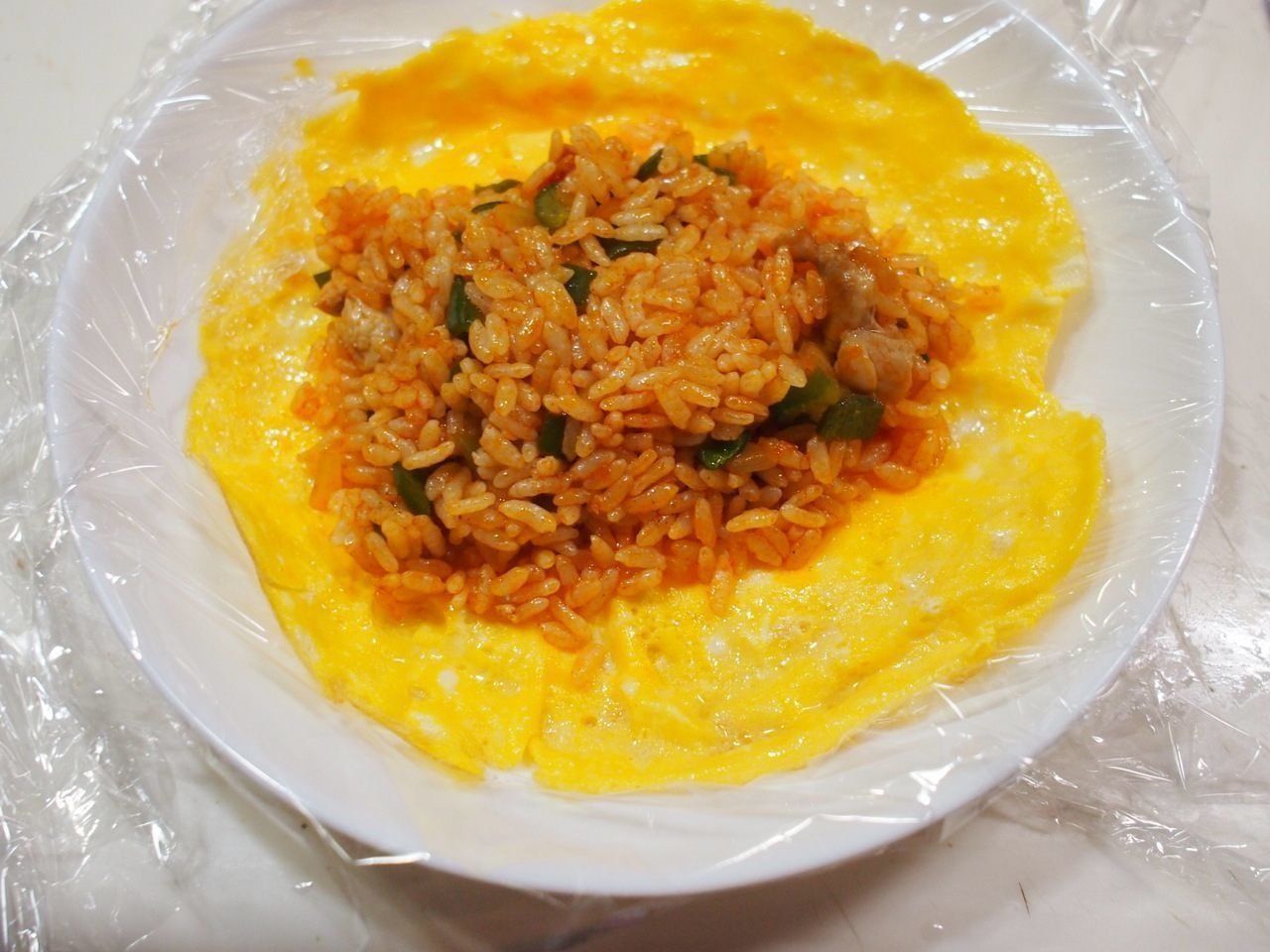 お皿の上にラップを敷き、その上に焼いた卵を敷きます。中心にチキンライスを持っていきます。ラップを両側からチキンライスを巻くようにしていきます。キャンディを包むような要領です。巻き終えたら、さかさまにしてラップを取ります。そうするとオムライスができているのです。