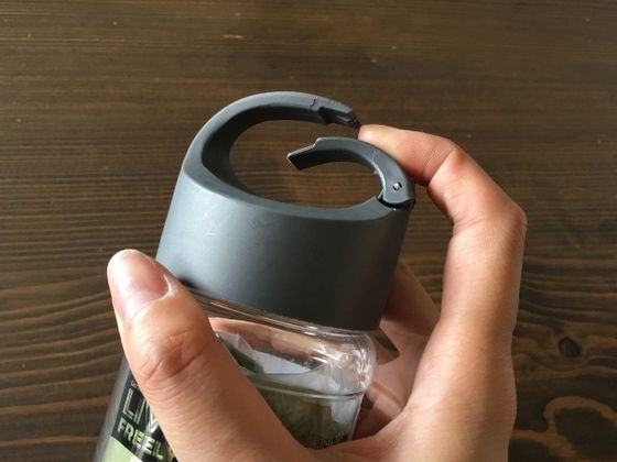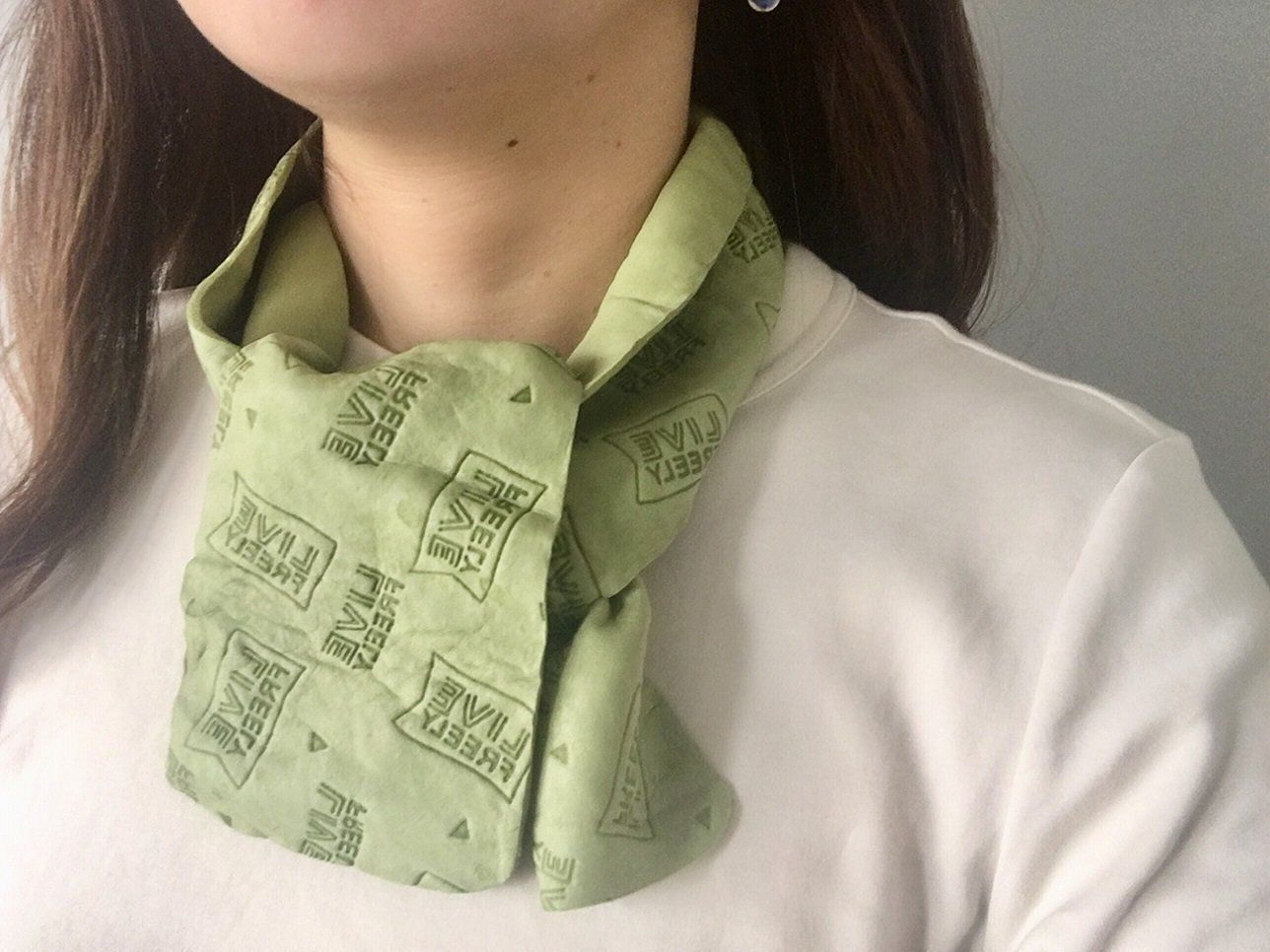 ケース付きで、タオルにはロゴデザインも。首に巻いて一回結ぶと写真ような感じになります。さらにケースのフタは上部分が外れてフックのようにもなります。バッグなどに取り付けられるので、携帯もしやすいですね。