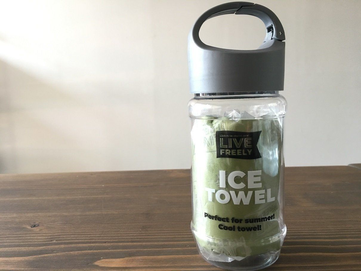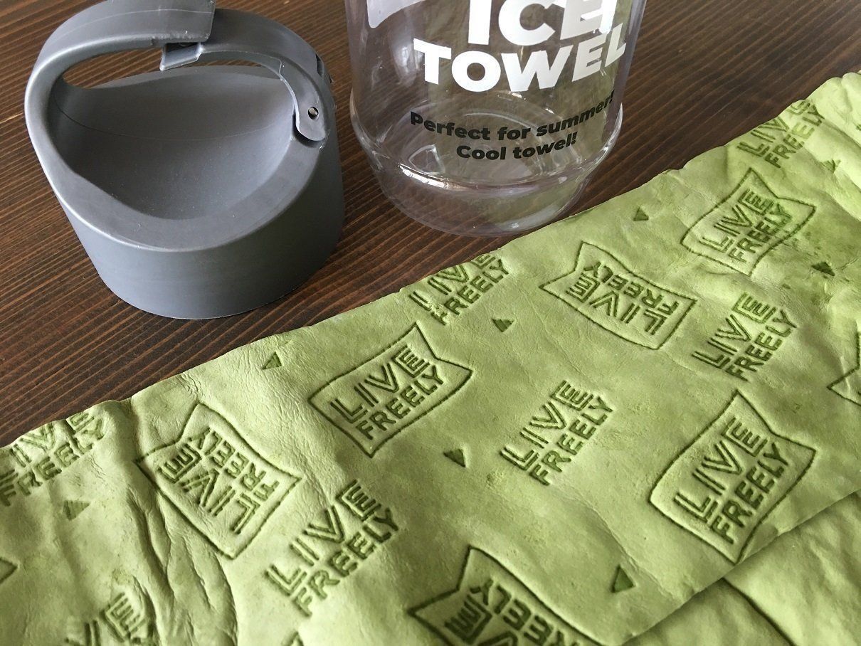 最初に紹介するのは、「ICE TOWEL」(300円)。ぬらすとひえひえになるタオルです。カラーバリエーションもあり、今回はその中からカーキ色をチョイスしました。