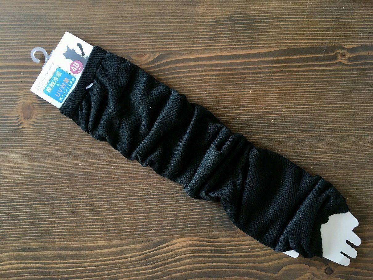 「涼感アームカバー」(300円)はポリエステル100%で、接触冷感なので、腕を通すと少しひんやりします。お洗濯は洗濯ネットを使えば洗濯機でも可能です。