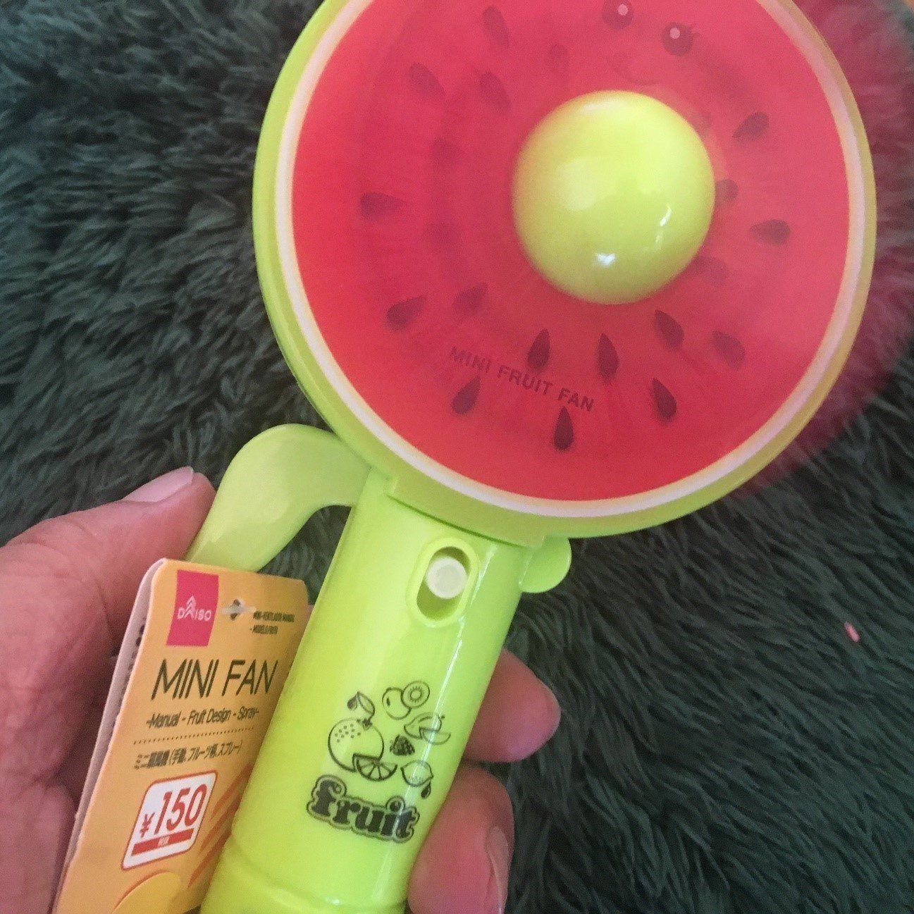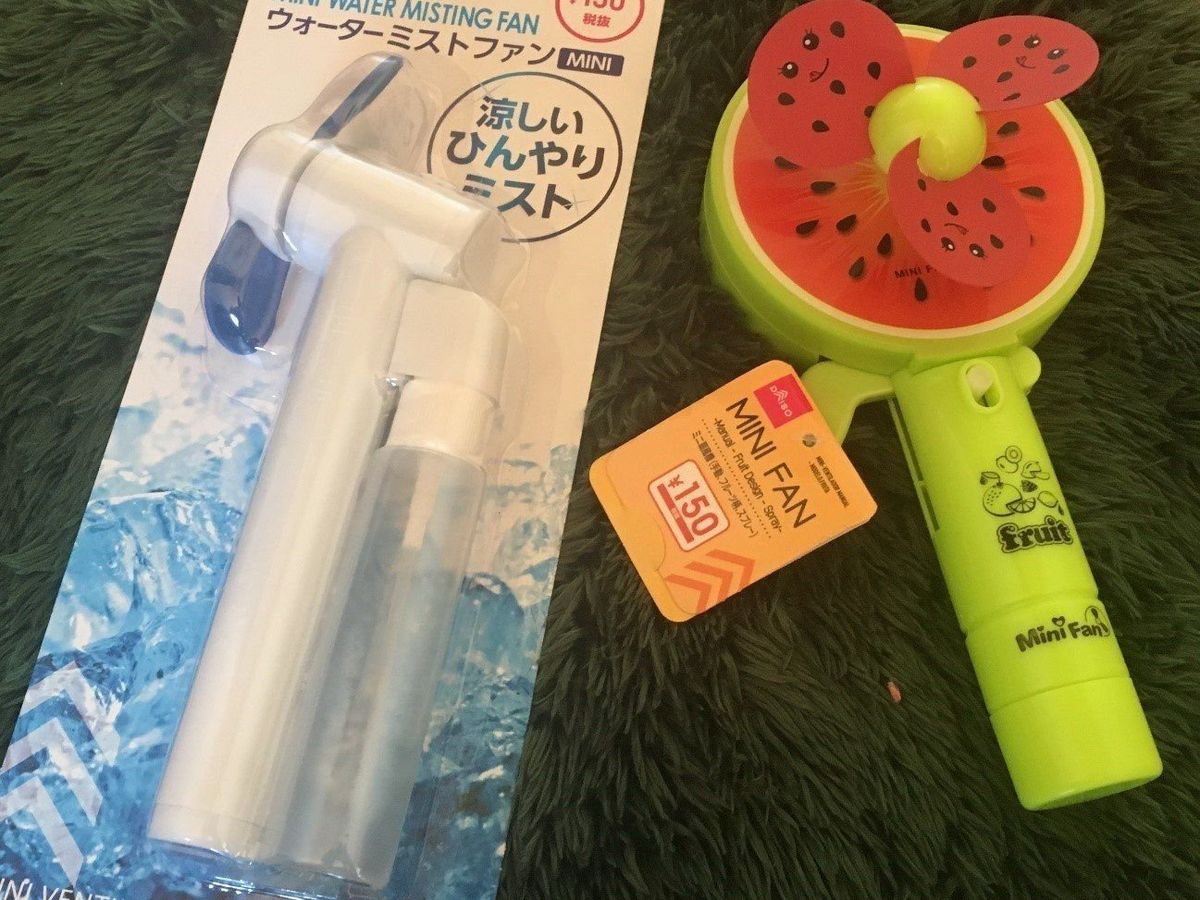 続いては、電動型の携帯扇風機。価格は手動タイプと同じ150円なのですが、こちらは電動に加えてミストにも対応しています。
