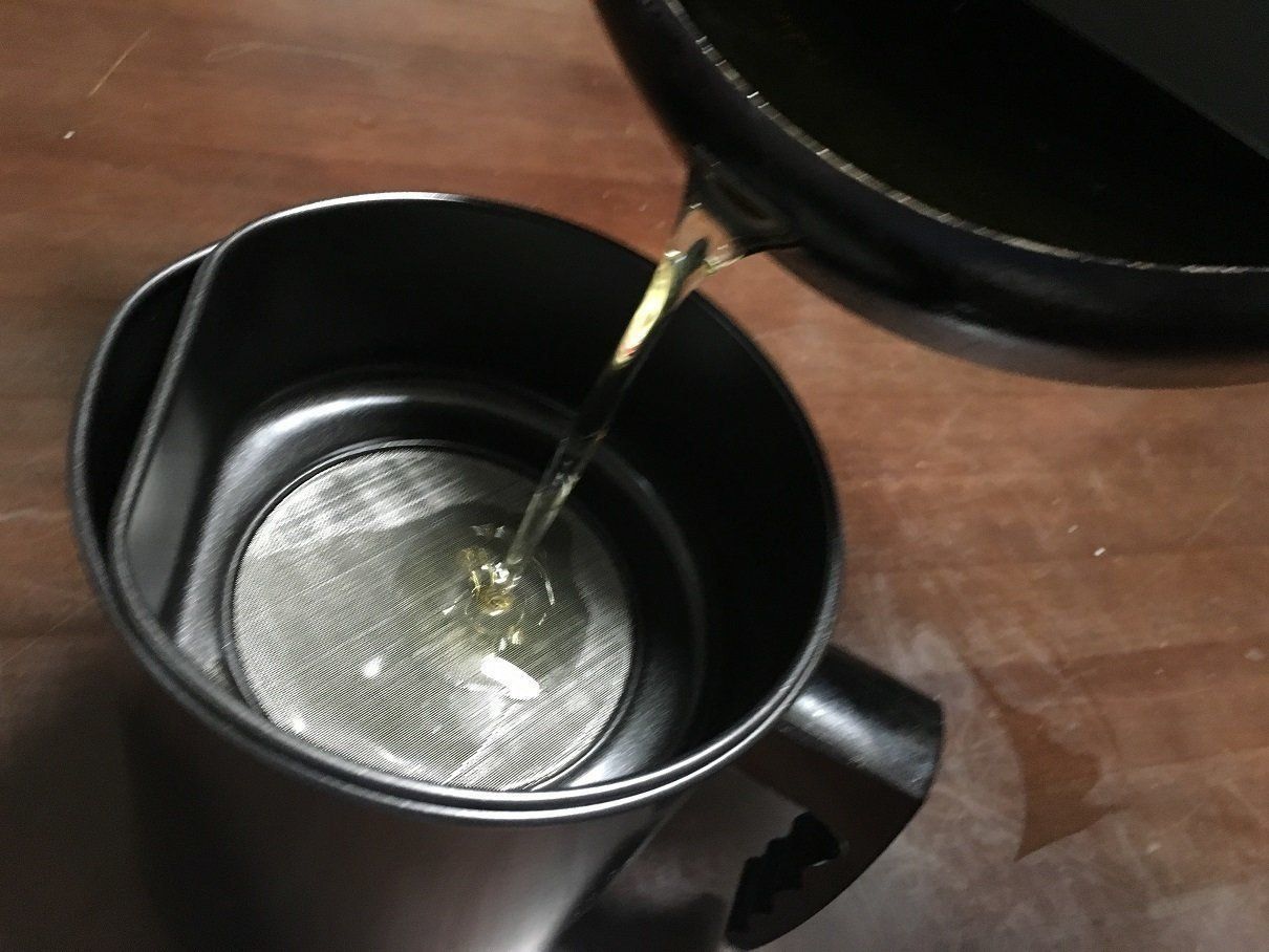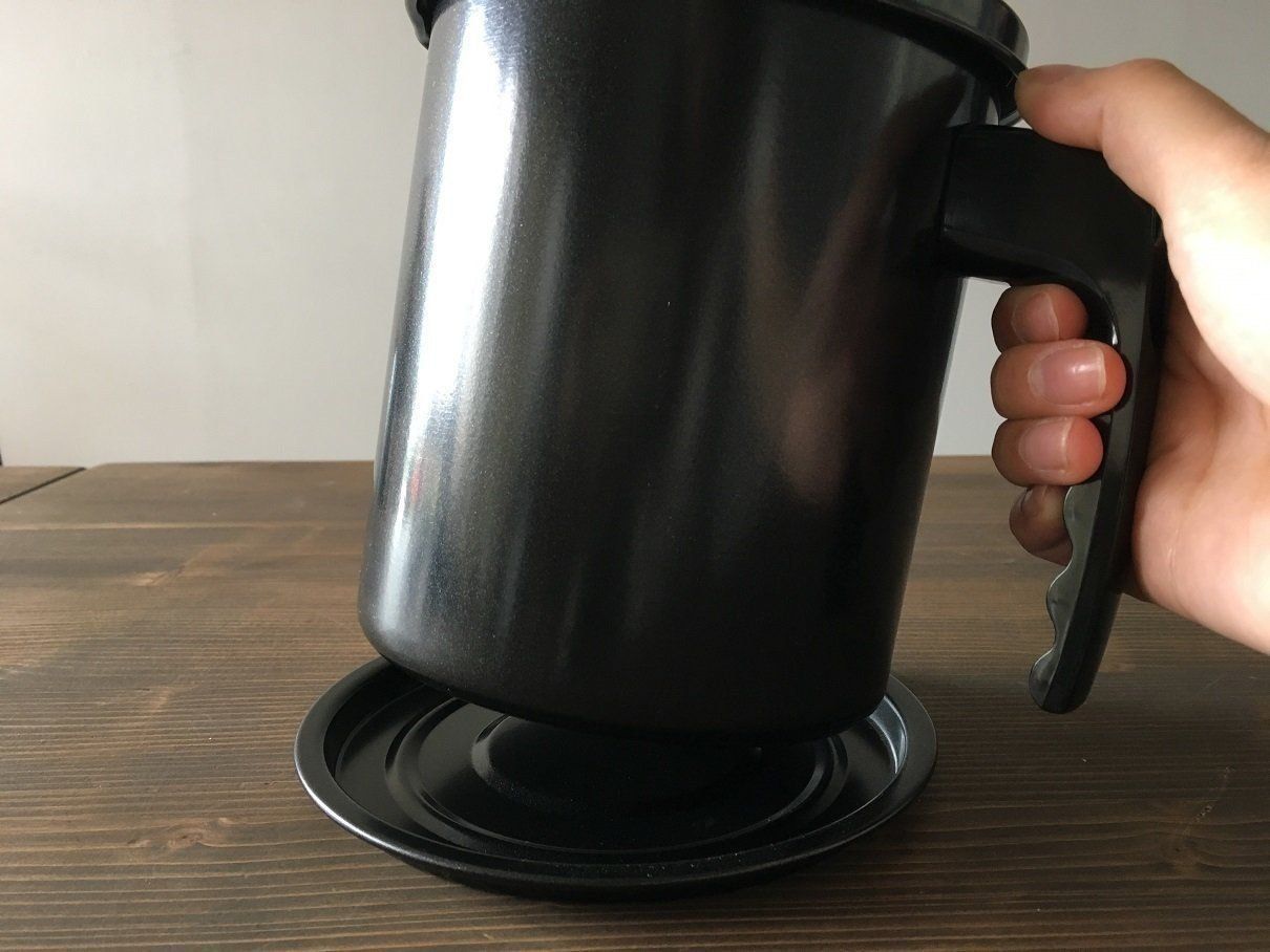 実際に使ってみると、取っ手部分のギザギザしたデザインが手にフィットして安定感があります。油をこすときは、ポットの中に網パーツを設置して使い終わった油を注ぐだけ。