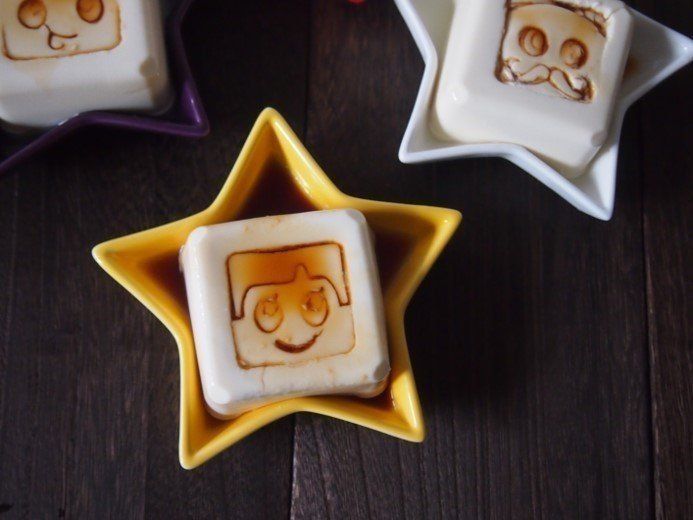 豆腐は、絹ごしを使用するとキレイに仕上がります。1人分の正方形の豆腐がバランスもいいのでおすすめです。スタンプを端から押し込み、しばらくキープします。このとき、あまり力を強くすると、豆腐が割れてしまうので気をつけてください。端からゆっくり離します。お好みの量の醤油をかければ、デコが浮き上がってきますよ。