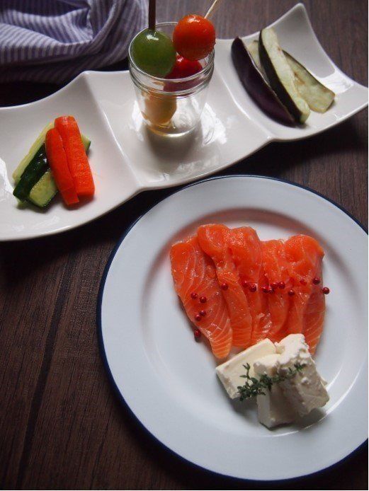 サーモン、ウズラの卵、チーズ、トマト、きゅうり、茄子などに素を揉み込み、1~2時間ほど漬けこめば完成!ちゃんといぶりがっこの味に!!