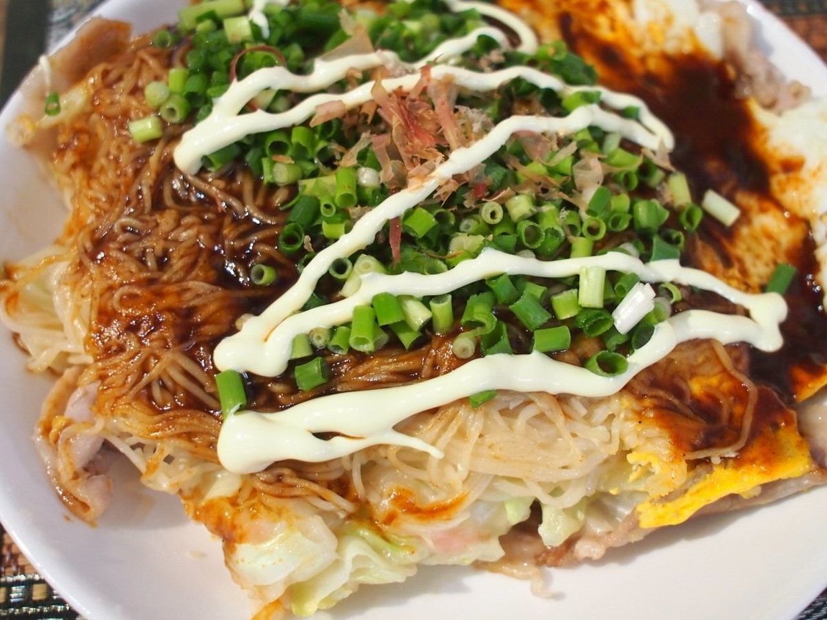 女将さんに聞いたつくり方のポイントは、”そうめんだけを油をひいたフライパンで炒めること”。炒める途中にはウスターソースを混ぜましょう。あとは、普通にお好み焼きをつくる方法と同じです。