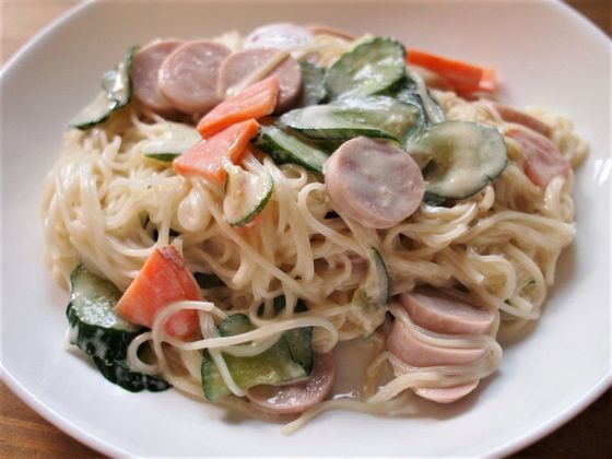 こちらもパスタの代用としてそうめんを使ったアレンジメニュー。スパゲッティサラダを、そうめんでつくってしまおうというものです。