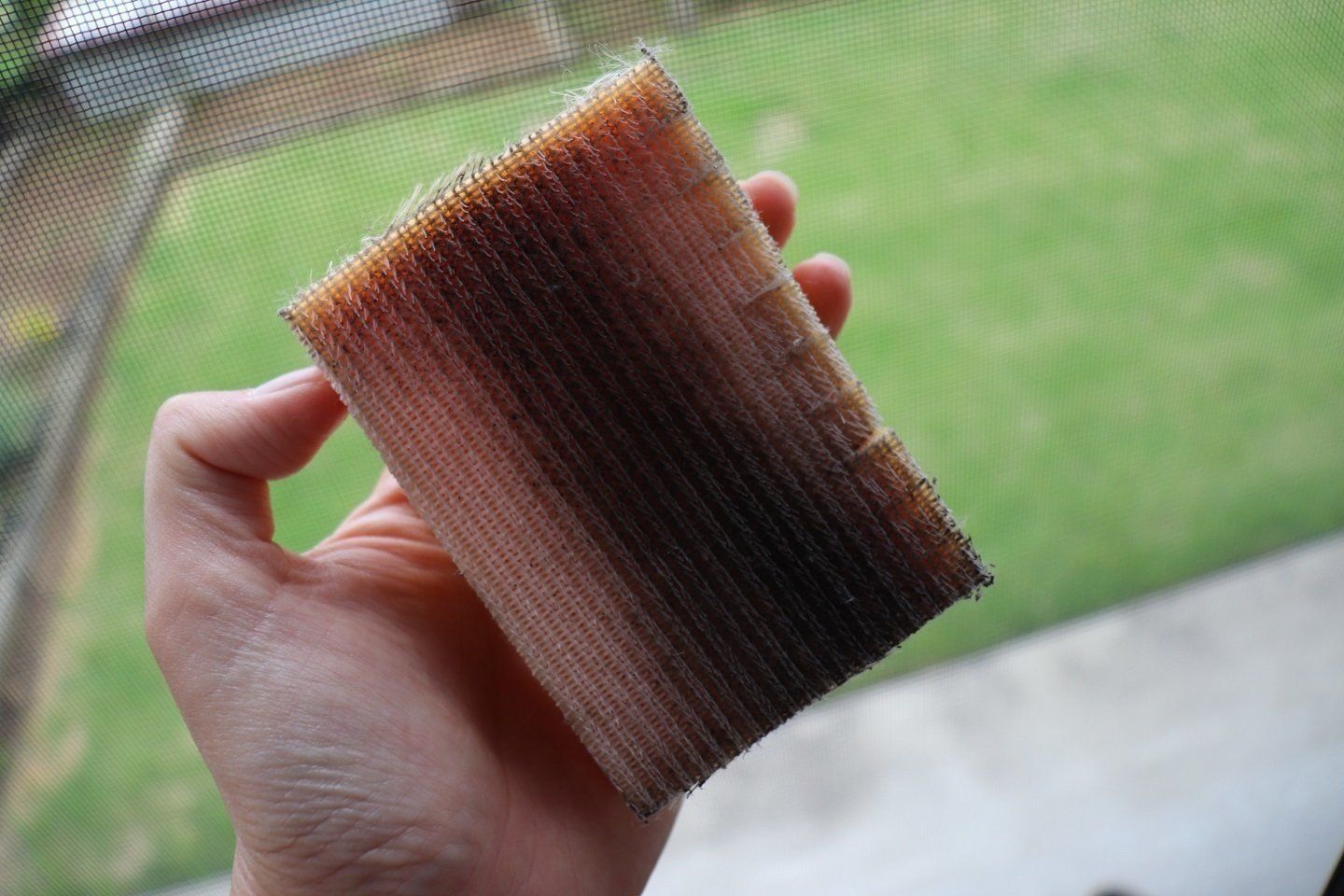 網戸をこすった後のスポンジがこちら。ホコリをかきだしてくれると同時に砂埃などの汚れもいっしょにキレイにしてくれます。汚れたスポンジは洗って繰り返し使えます。