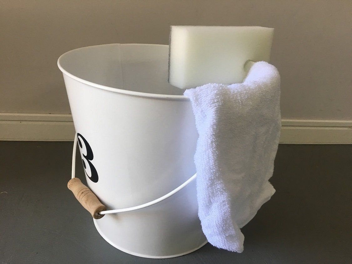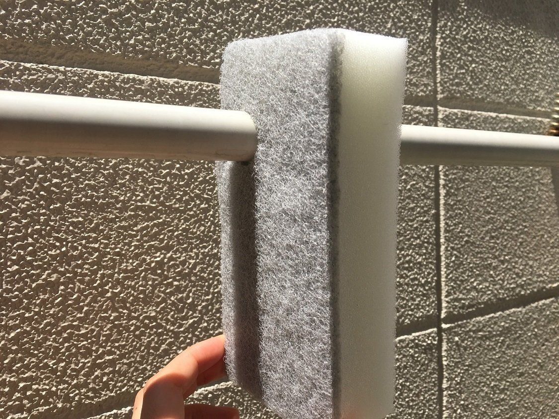 本体の左上に空いている穴には、横に切り込みが入っていて、太さ2cmまでの棒などにかけることが可能。バススポンジとして販売されていますが、外で使う用にするのもおすすめ。たとえば、写真のようにバケツにセットしておけば、取り出しやすい&早く乾いて清潔感も保てます。