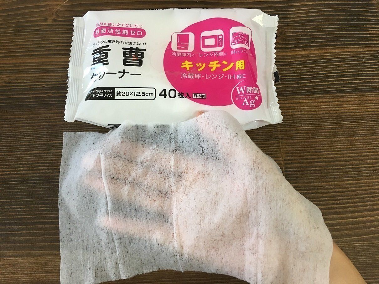 重曹クリーナーは、セスキより弱いアルカリ性。これもキッチン用品の掃除に向いています。そして、このシートは前の2つよりも除菌効果が高く、エタノールの臭いがします。