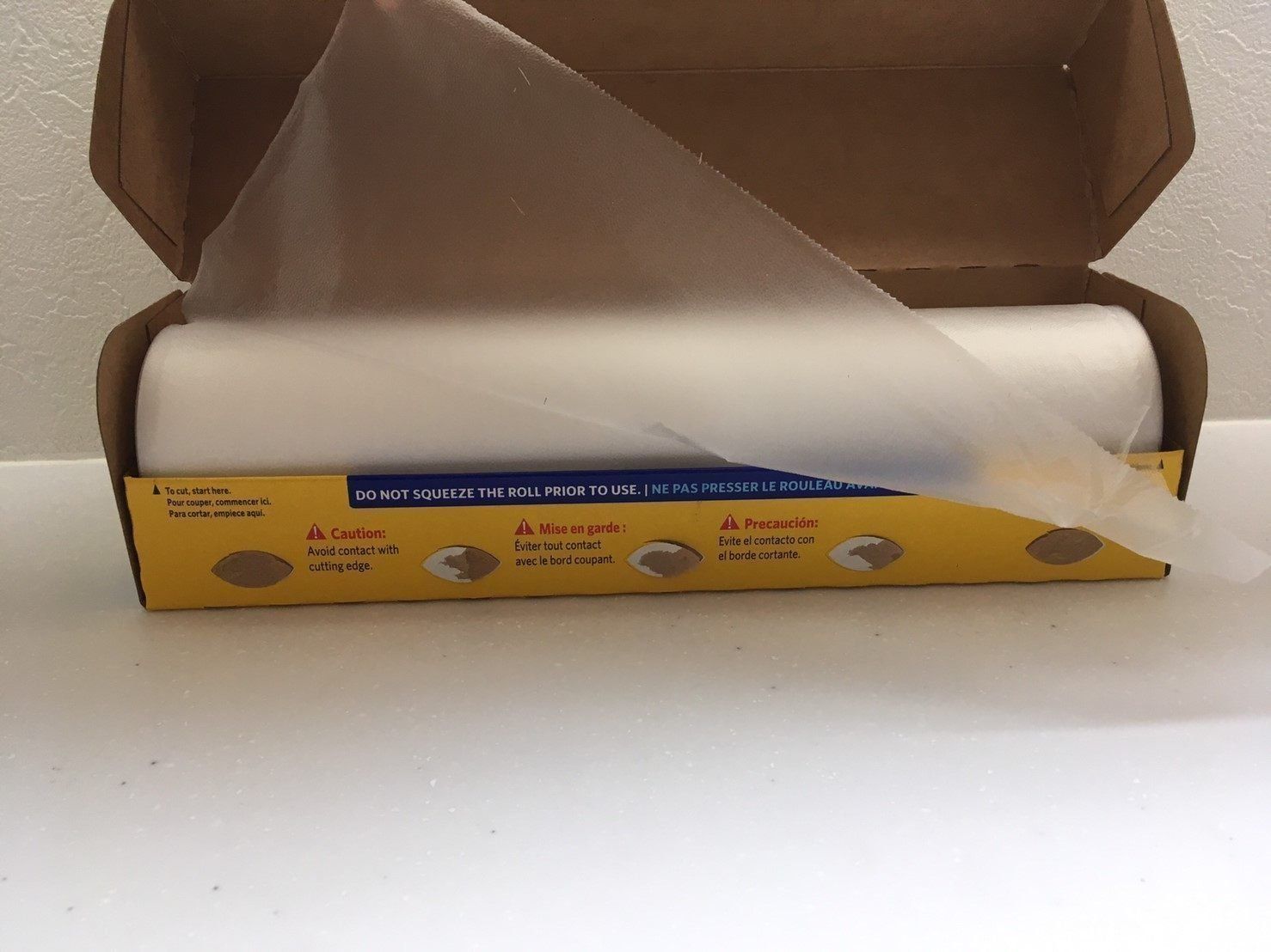 このラップ、裏側はサラッとしていながら、粘着力があるような、滑り止めみたいなちょっと不思議な感触。使い始めは箱が重くて、いつものラップのように持ち上げて使うのは少ししんどいので、置いたままカットしたほうがいいかも。