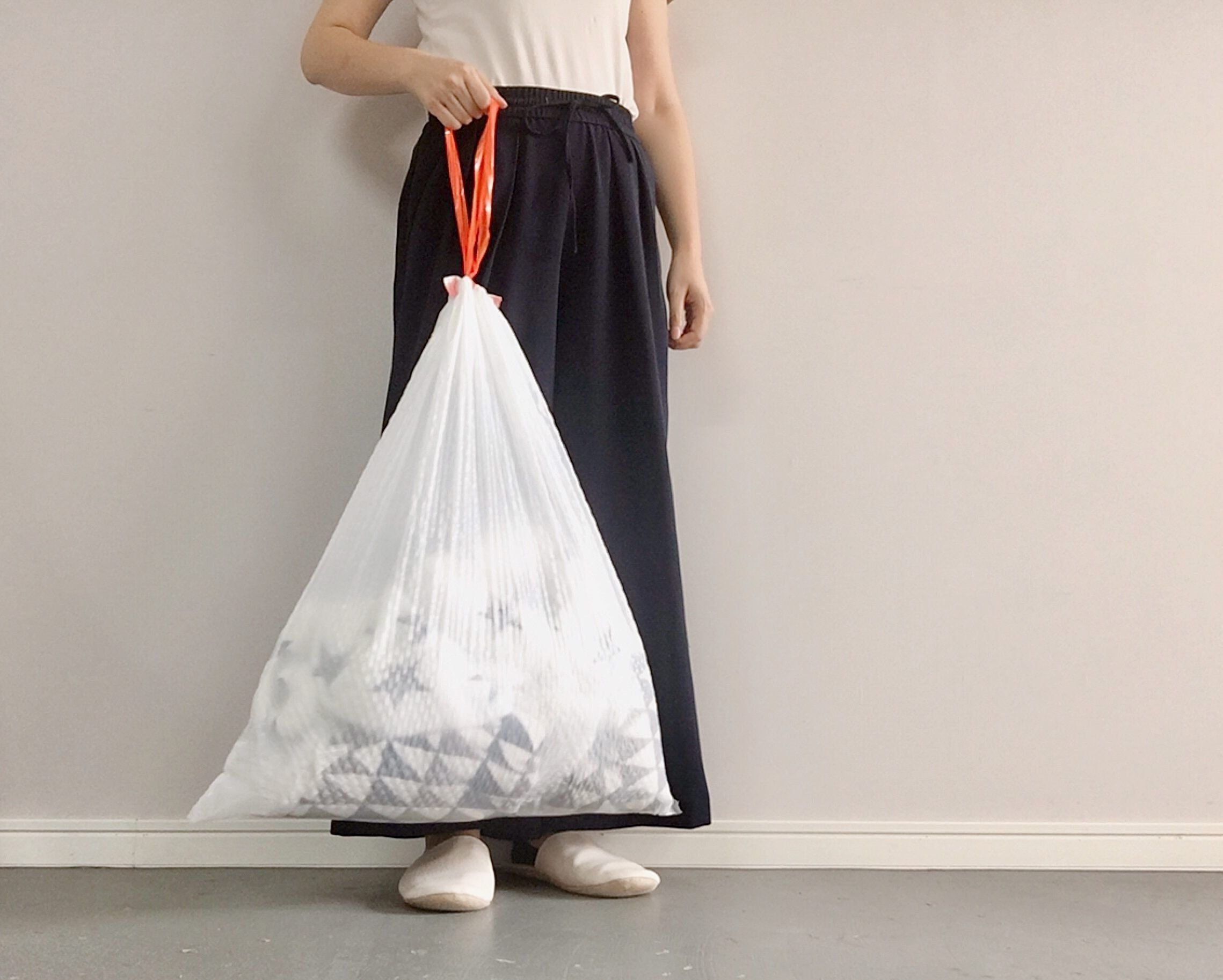 写真は分かりやすく、夏シーズンに使っていない厚手のブランケットを入れてみました。中身が透けるので、何が入っているかわかりやすいですよね。オレンジの紐も1度結んだだけなら15cmほどの長さがあるので持ち運びもしやすい。