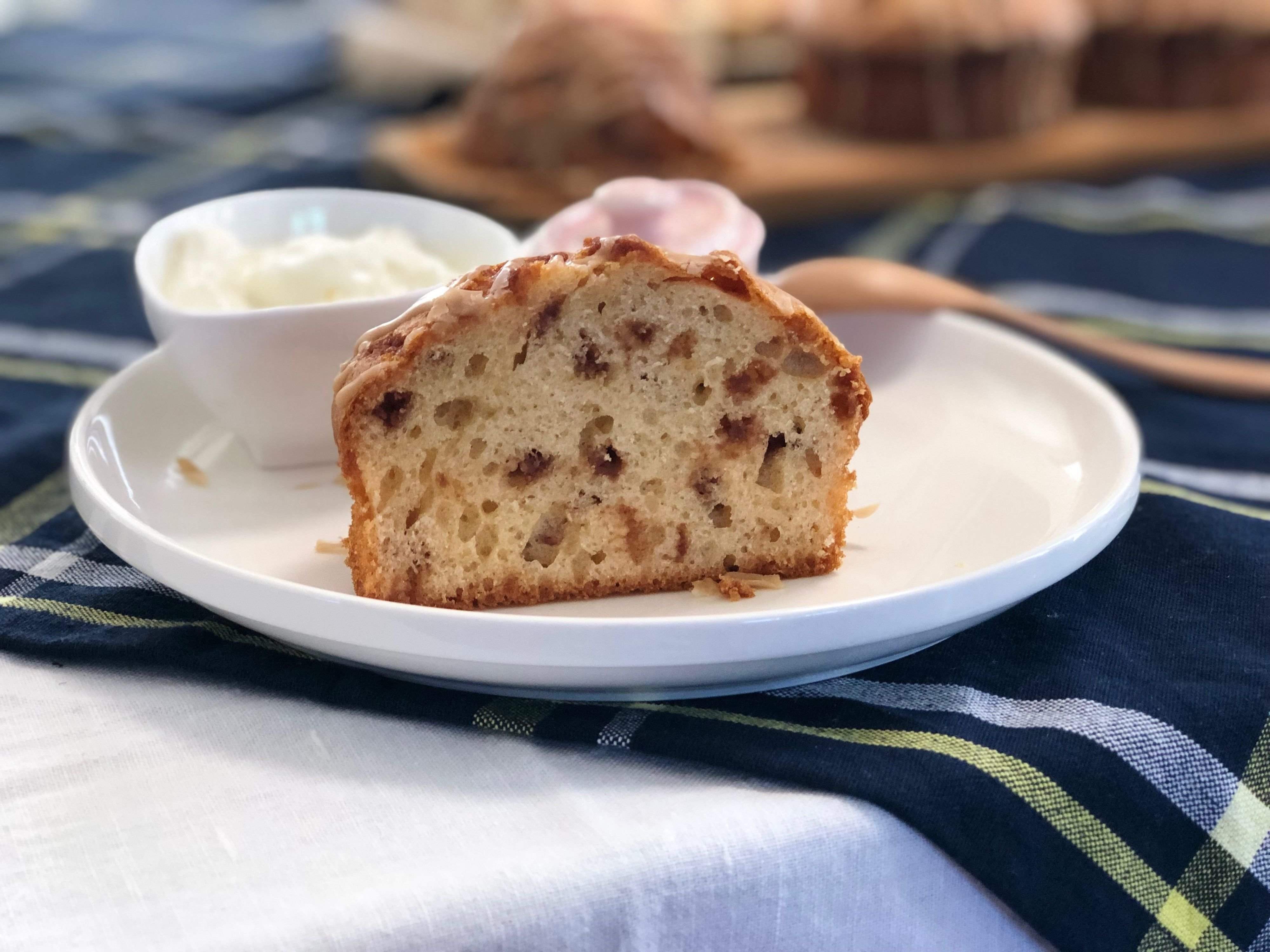 シナモンが効いていてとっても風味がよく、メープルシロップの甘い香りと味わいが特徴的なフレンチトーストマフィン。上面に網状にかかった「グレーズ」という砂糖がけの部分が、サクサクとしたよい食感をもたらしています。ちなみに切ってみると……写真のとおりシナモンチップスがこんなに入っているのが、風味のよさを出しているのですね。