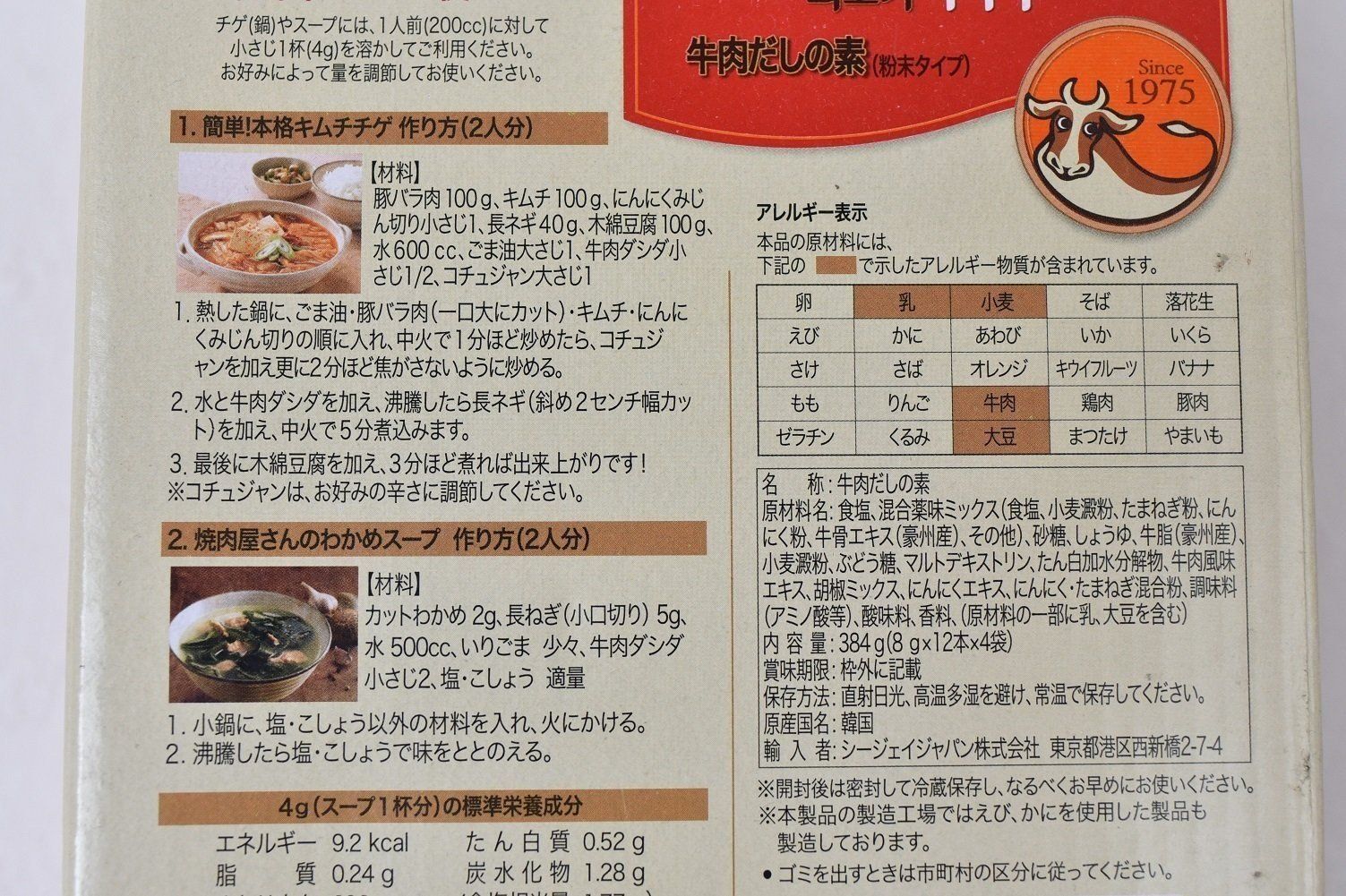 箱の裏面にはレシピも記載されています。今回購入した箱に記載されていたのは、キムチチゲとわかめスープのつくり方でした。