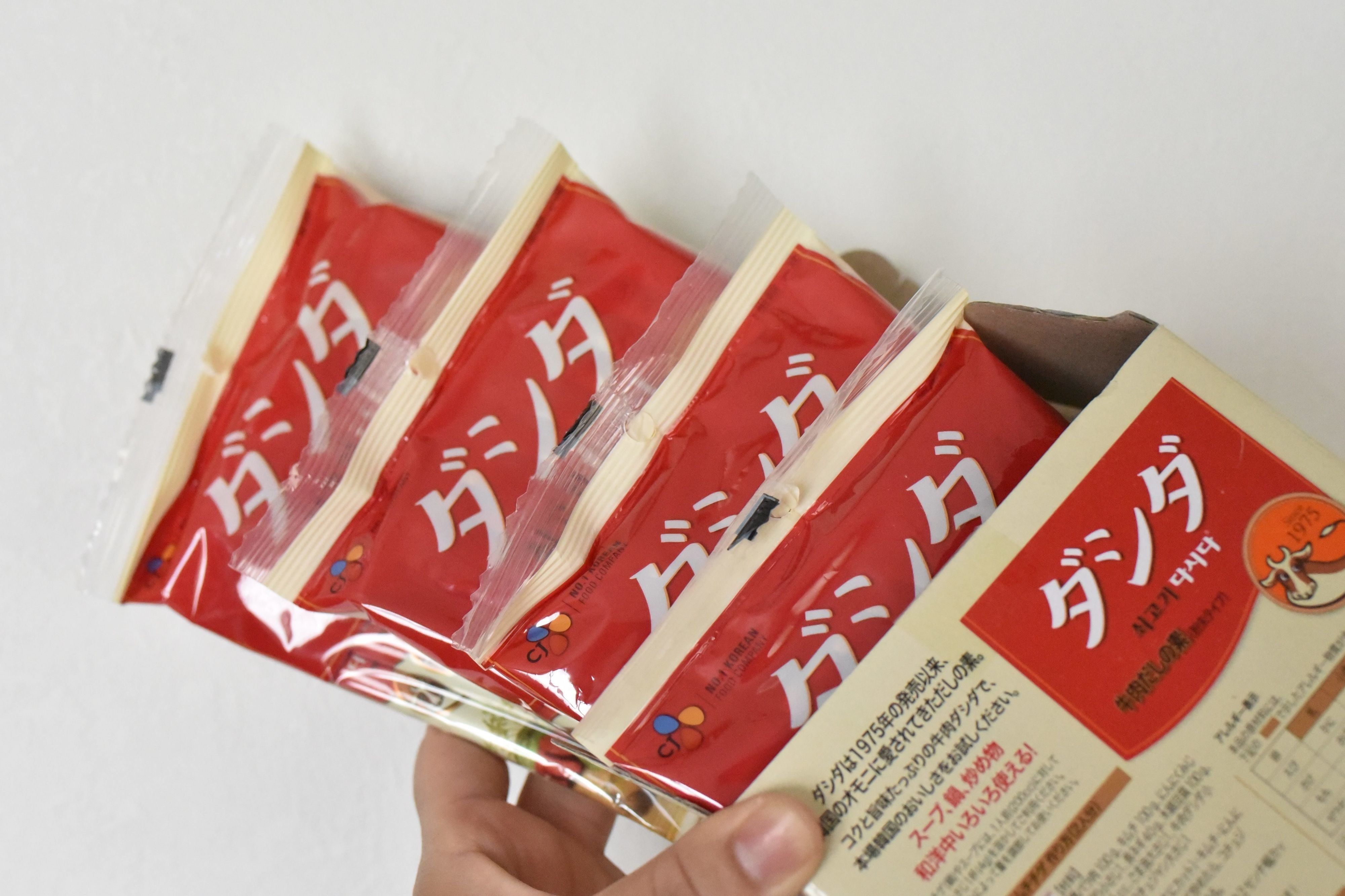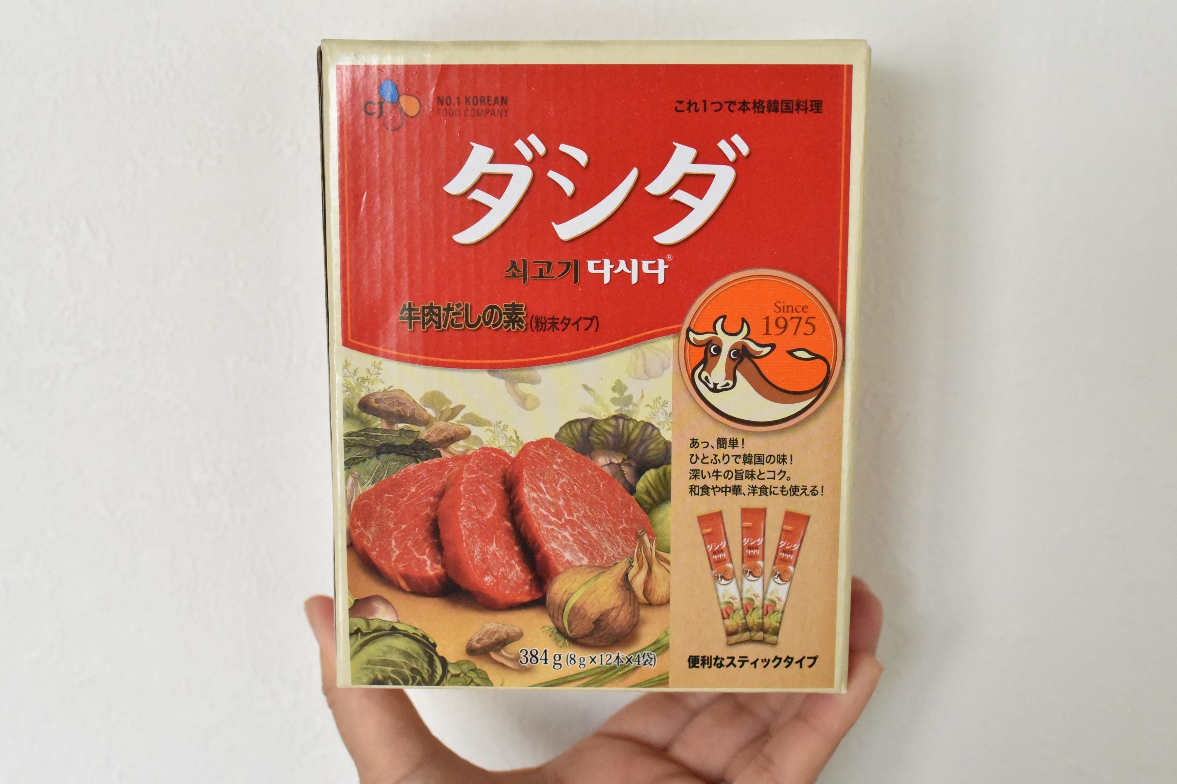 ダシダは牛肉だしの素。韓国で長年愛され続けてきている調味料で、スープや鍋料理、炒め物など幅広く活用できます。韓国の調味料と聞くと、辛いのではないかと感じるかたもいらっしゃるかもしれませんが、辛みはなく旨みがたっぷりつまった粉末です。
