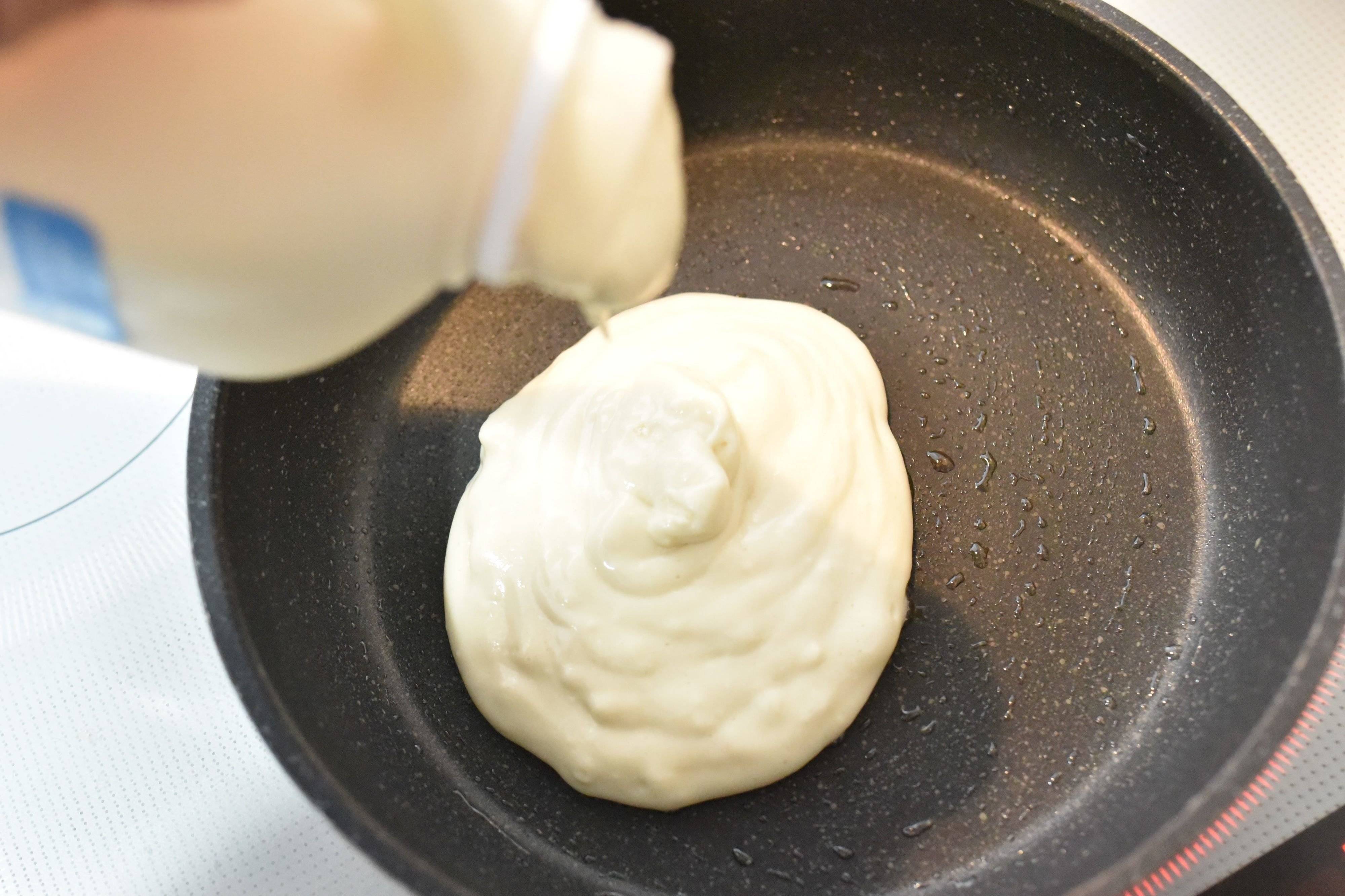ボトル内で混ぜ合わせた後は、フライパンにボトルから直接流し込んで、お好みのサイズのパンケーキを焼くのみ。