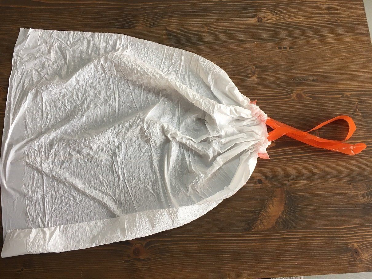 箱の中には写真のように100枚ずつのロールが2つ入っています。ギッシリと詰まっていますが、外側から引っ張るとスルっと簡単に取り出せます。オレンジ色の部分が紐になっていて、この紐でゴミ箱に合わせて調整したり、口を締めたりできます。