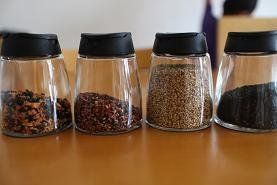 以前から調味料入れを探していたにいかわみかさん。IKEAで、4個セット798円のびん製の調味料入れを見つけて購入。ふたは、中身を出す量が選べるように2つにわかれているので便利なのだとか。調味料だけではなく、子どもが食べるふりかけも入れて使うことにしたそうですよ。