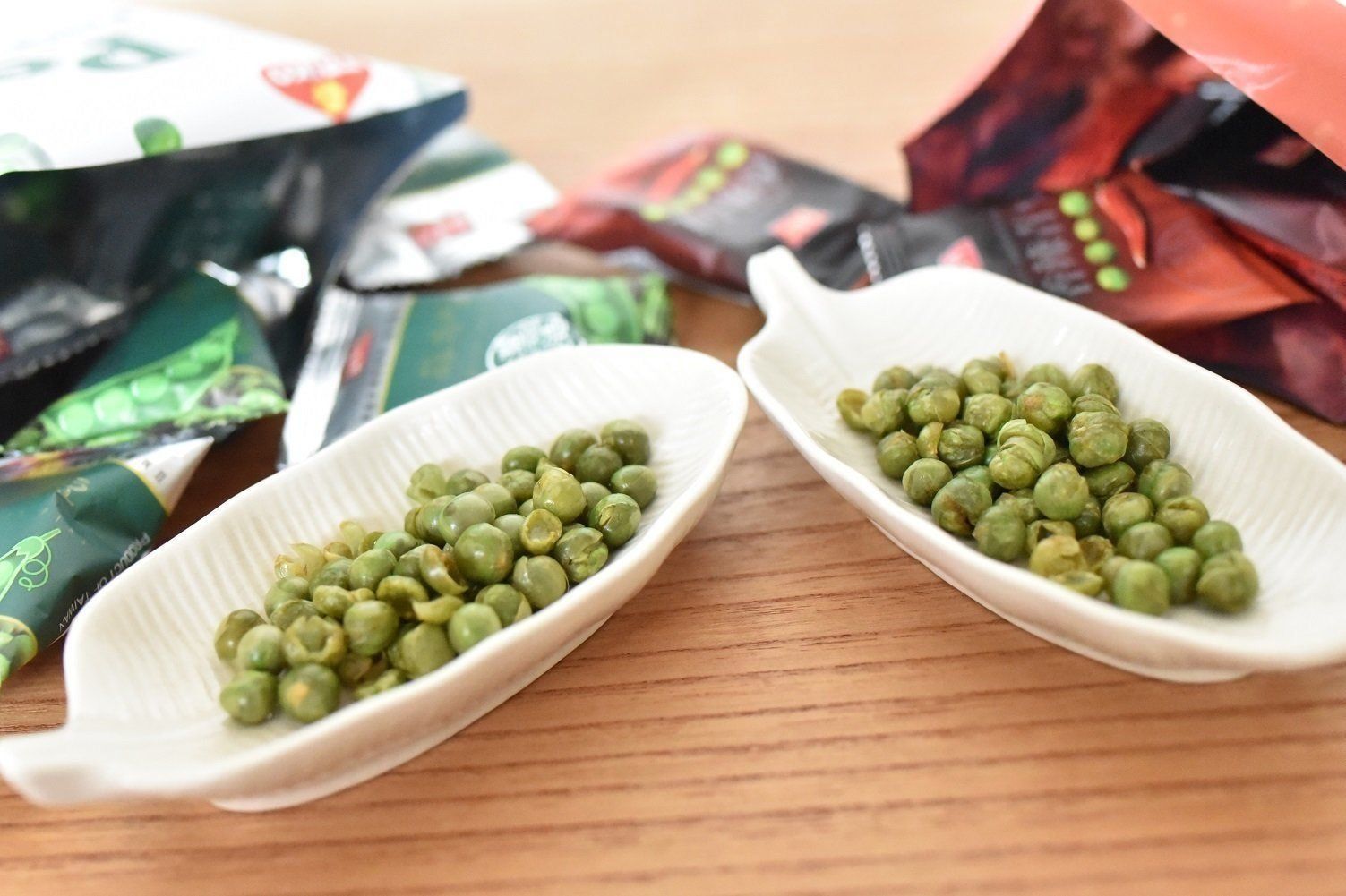 おつまみ用として購入した「Peas」ですが、子どもたちも気に入ったようで、2つの味を比べながら楽しんで食べています。包装を開けて皿に移すと、ぱっと見では判断がつきにくいくらい見た目が似ているので、どちらが何味かを判断するためには、味覚が問われますよ~。