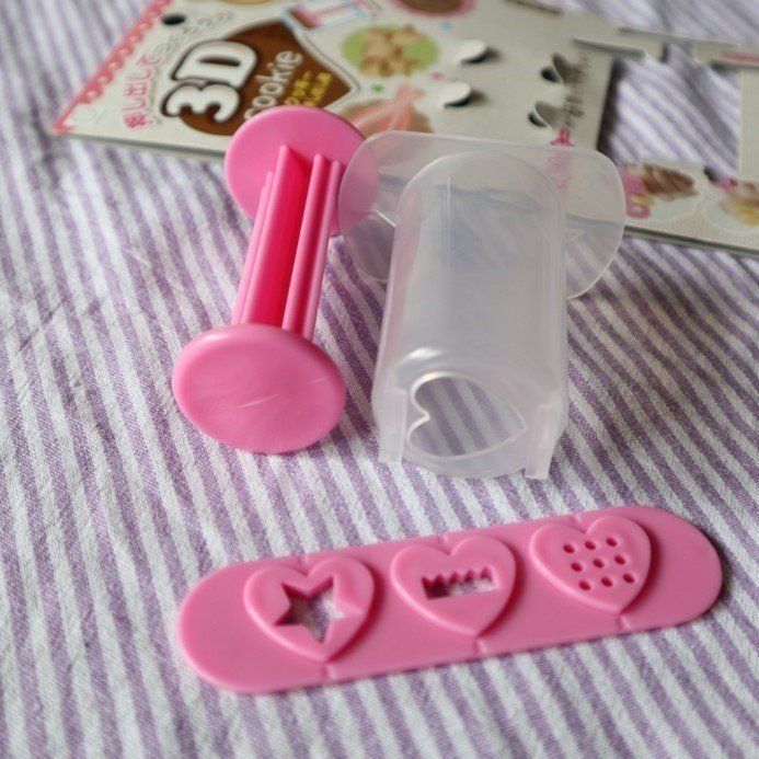 ダイソーの3Dクッキー押し出し器100円。3種類の模様とハート型の計4種類あります。成形次第でいろいろな形がつくれます。
