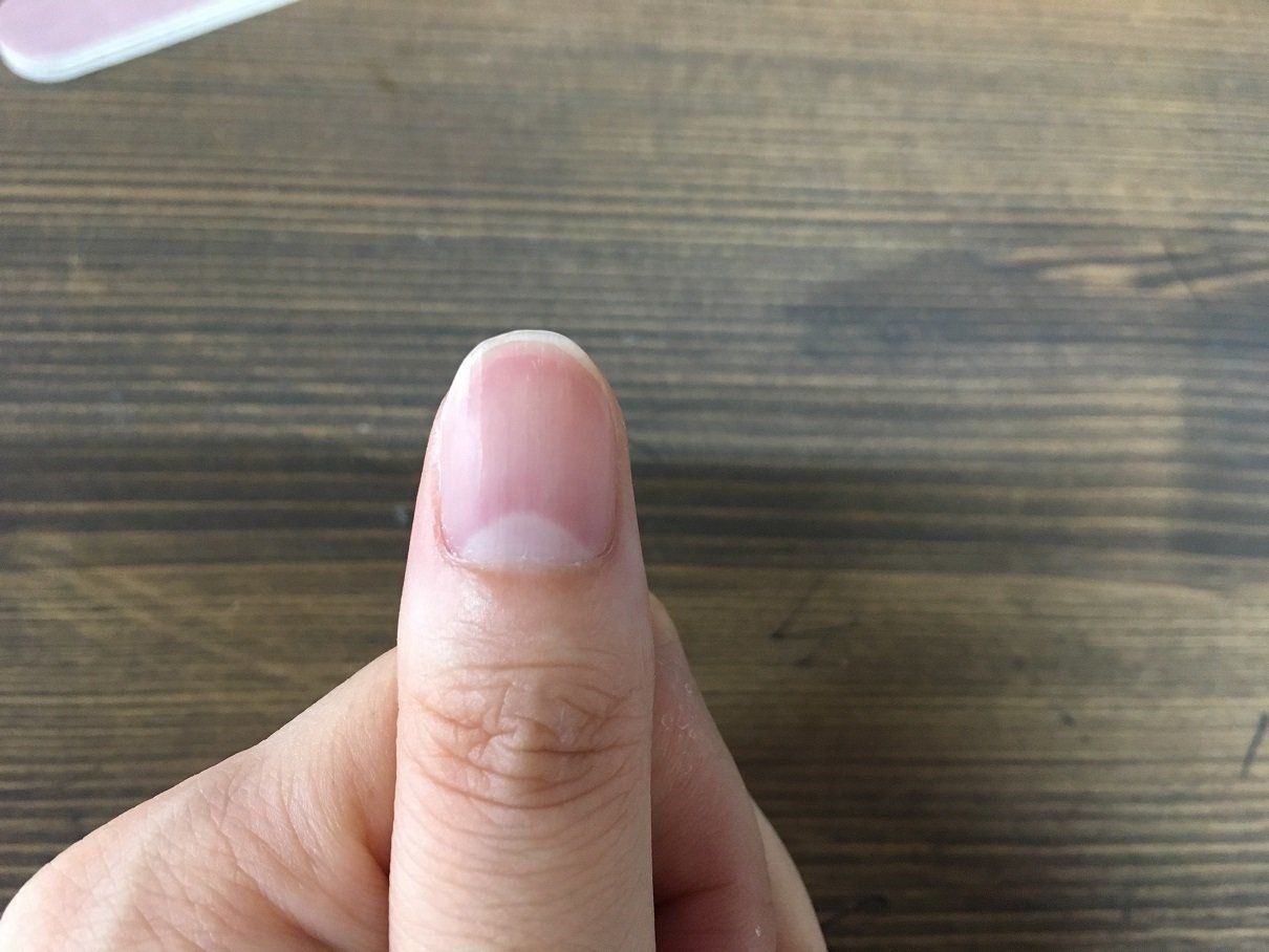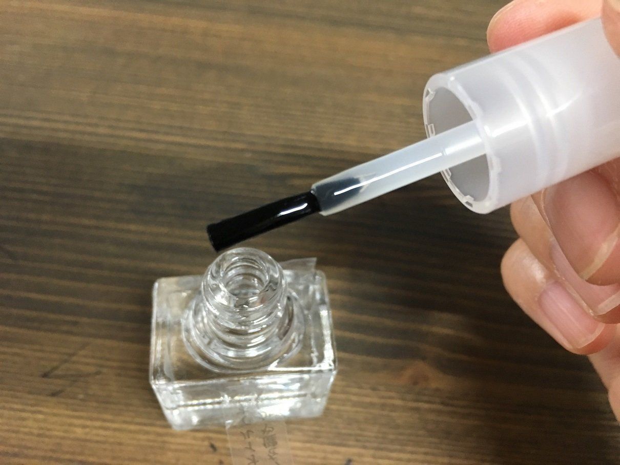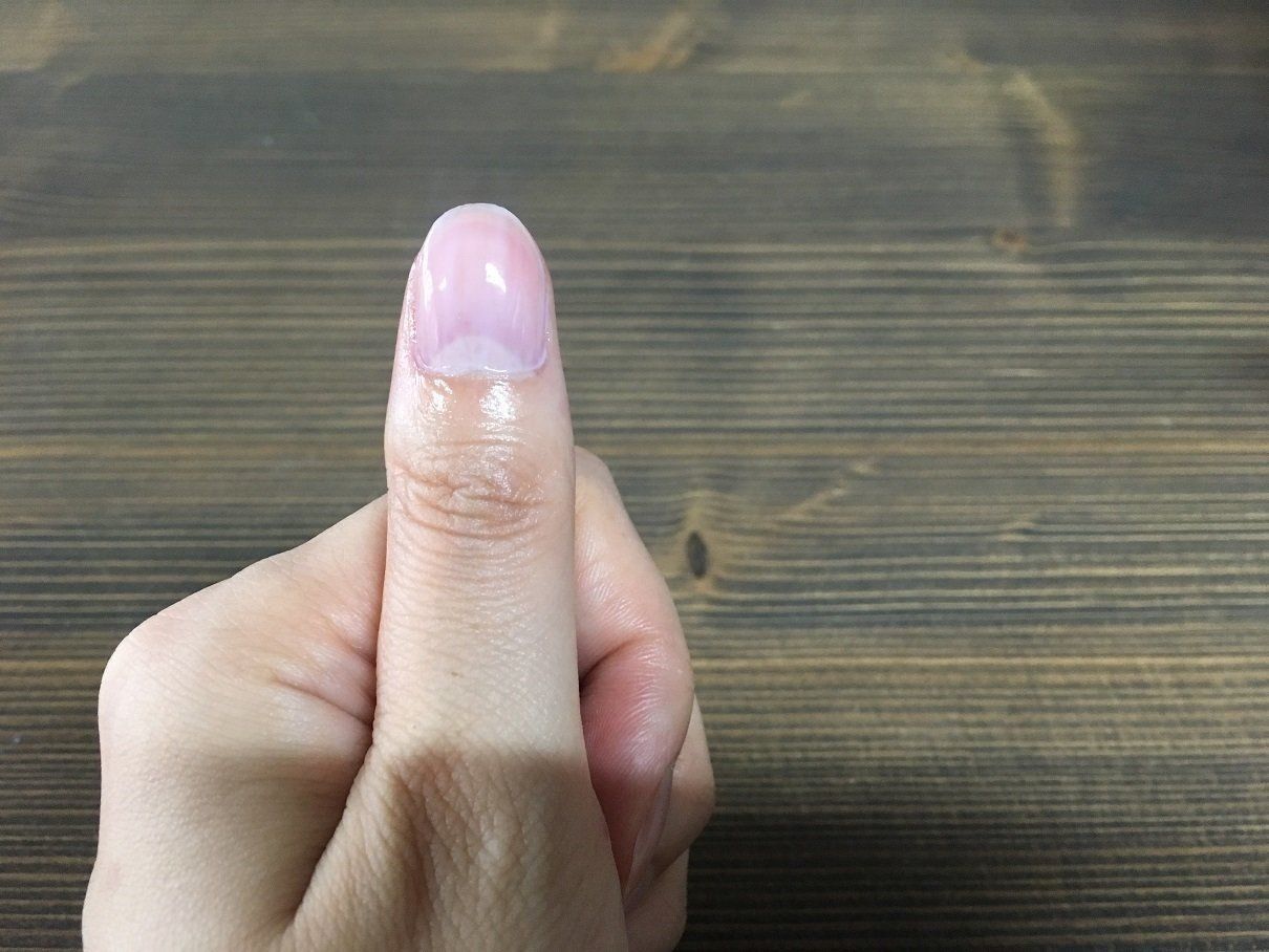 最初に紹介した爪やすりで形と表面を整えたら、「ベースコート」(税込490円)も忘れずに。商品自体は薄いピンクですが、塗ってみるとほとんど発色はしません。仕事上などでネイルができないかたも、これならOK。写真は1回塗りしたところです。