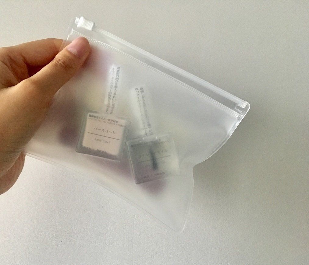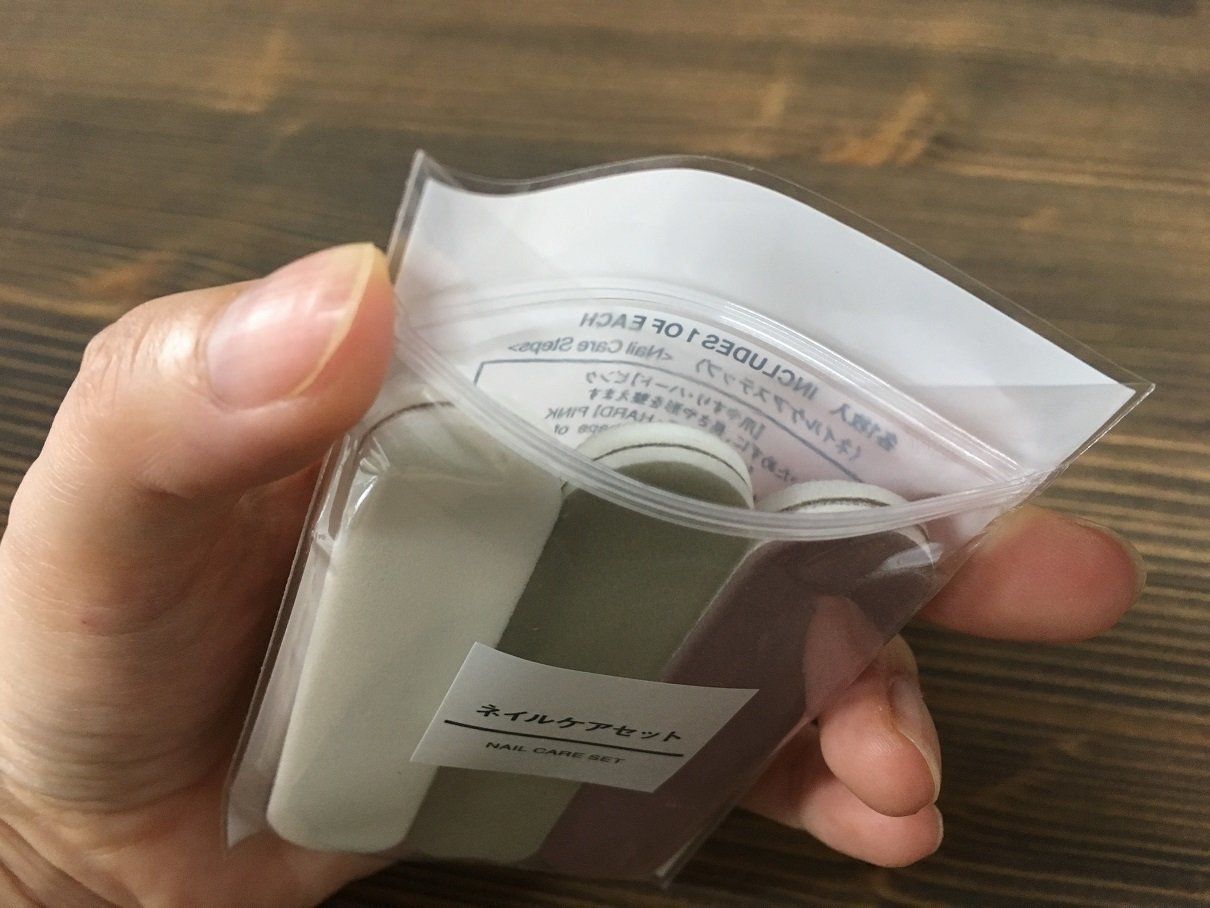 無印良品には使いやすい爪切りが販売されていますが、おすすめするのは「ネイルケアセット」の爪やすり(税込190円)!バラ売りもしているネイルケアグッズが3本セットになっていて、袋がジップ式になっているからこのまま持ち運びできます。